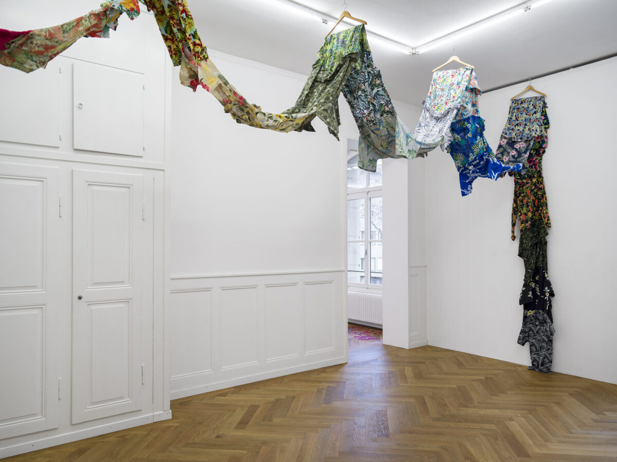 In der Installation Build me up von SERGIO ROJAS CHAVES finden sich textile Scherenschnitte in satten Farben, über Kunststoffstrukturen drapiert oder zu Stapeln aufgehäuft. Sie wecken Assoziationen zu den Abfallbergen von Kleidungsstücken in der Atacama-Wüste, wo die Reste der Überproduktion von Fast Fashion landen. Die an Möbelstücke erinnernden Strukturen aus Acrylglas schaffen Bezüge zu wiederkehrenden Trends aus dem Möbeldesign der 1990er Jahre. Die damit assoziierte minimale, moderne Ästhetik wurde von IKEA aufgenommen, in günstiger Massenproduktion und zum DIY-Zusammenbau für die breite Masse zugänglich gemacht. Der Möbelproduzent bietet neben Dekorationsartikeln auch tropische Zimmerpflanzen an, die ebenso leicht zu kaufen, entsorgen und zu ersetzen sind. Umrisse solcher Pflanzen, die in Ländern des globalen Südens heimisch sind und bei uns ein Dasein in Innenräumen fristen, hat Sergio Rojas Chaves aus Textilien mit tropischen Motiven von Pflanzen, Blumen und Vögeln ausgeschnitten. Die Scherenschnitte scheinen sich auf den Möbelstücken auszuruhen, als wäre ihre dekorative Funktion erschöpft und sie den Trends der Innenarchitektur ausgeliefert. Mit Build me up greift Sergio Rojas Chaves die Kurzlebigkeit und Austauschbarkeit bestimmter Motive und Vorstellungen auf, aber auch konkreter Dinge wie Kleidung, Inneneinrichtung oder Zimmerpflanzen. Die konstante Verfügbarkeit all dieser Dinge lässt uns vergessen, woher sie kommen, welche Wege sie zurückgelegt haben, wohin sie gehen, wenn wir sie aussortieren und entsorgen.