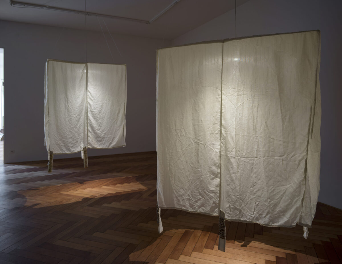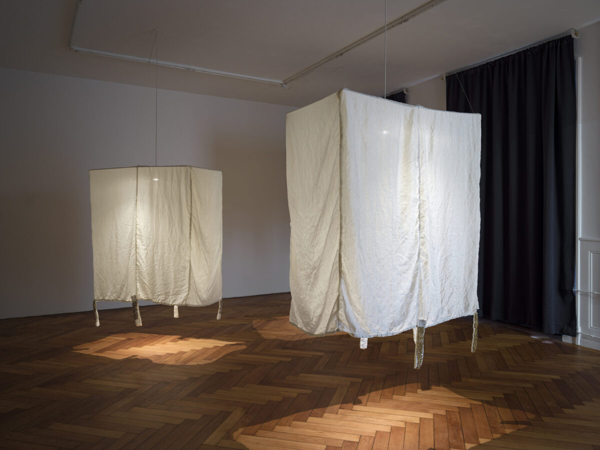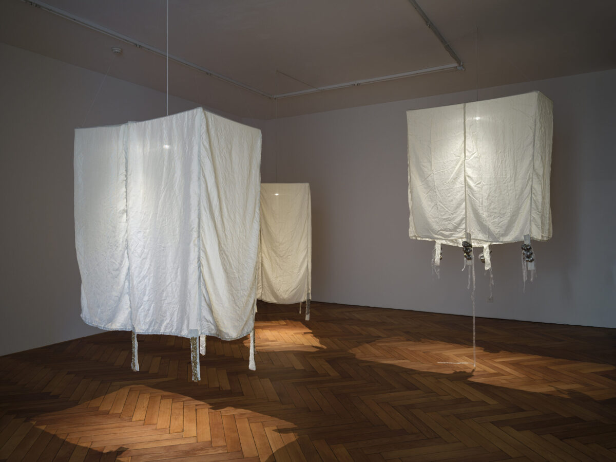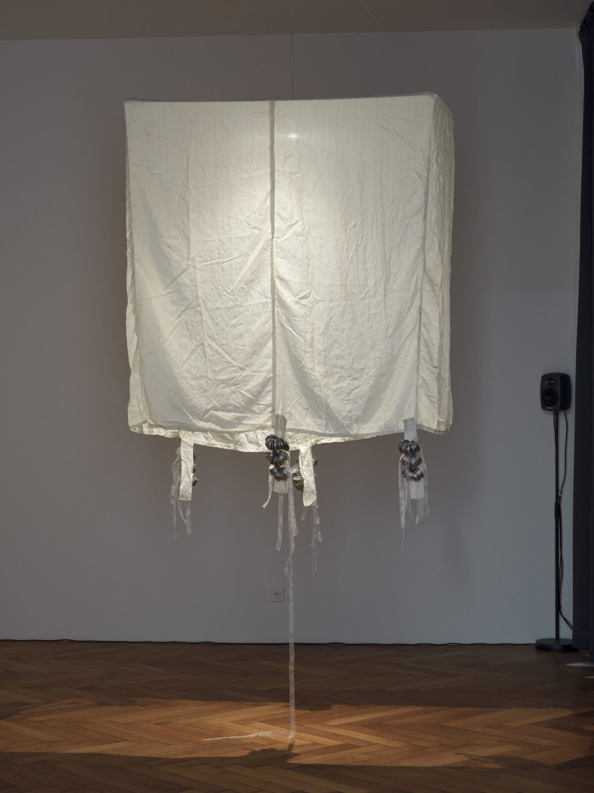 «Leichte Gefässe für schwere Nachrichten» zu kreieren, so beschreibt Rhoda Davids Abel ihre künstlerische Absicht. Die Auseinandersetzung mit Tod, Trauma und Spiritualität spielt ebenso in die Arbeit hinein wie der Versuch der Selbstverortung durch die Kontaktaufnahme mit den eigenen Ahn*innen – über Generationen sowie Grenzen der Kommunikation und kulturellen Verständigung hinweg. Für Davids Abels Arbeiten ist es bedeutsam, dass sie in Kollaboration mit Familienmitgliedern oder lokalen Communities entstehen. Die Hüllen wurden von einem Cousin genäht, der sich üblicherweise der textilen Ausstaffierung von Särgen widmet, und von der Künstlerin im Anschluss in Handarbeit bestickt. Die Audiospur besteht aus Feldaufnahmen, die Davids Abels auf ihrer Reise nach Tansania und Südafrika aufgenommen hat. Sie dokumentiert persönliche Begegnungen, rekonstruiert die spezifische Akustik der besuchten Gegend um den Berg der Ziegenhirten und schafft eine atmosphärische Klangkulisse, durch die die Wolkenobjekte zu ziehen scheinen. Darin treffen das Zirpen der Zikaden, das Rauschen des Windes, Stimmaufnahmen, Tanzschritte, Reifengeräusche und Glockenläuten aufeinander.