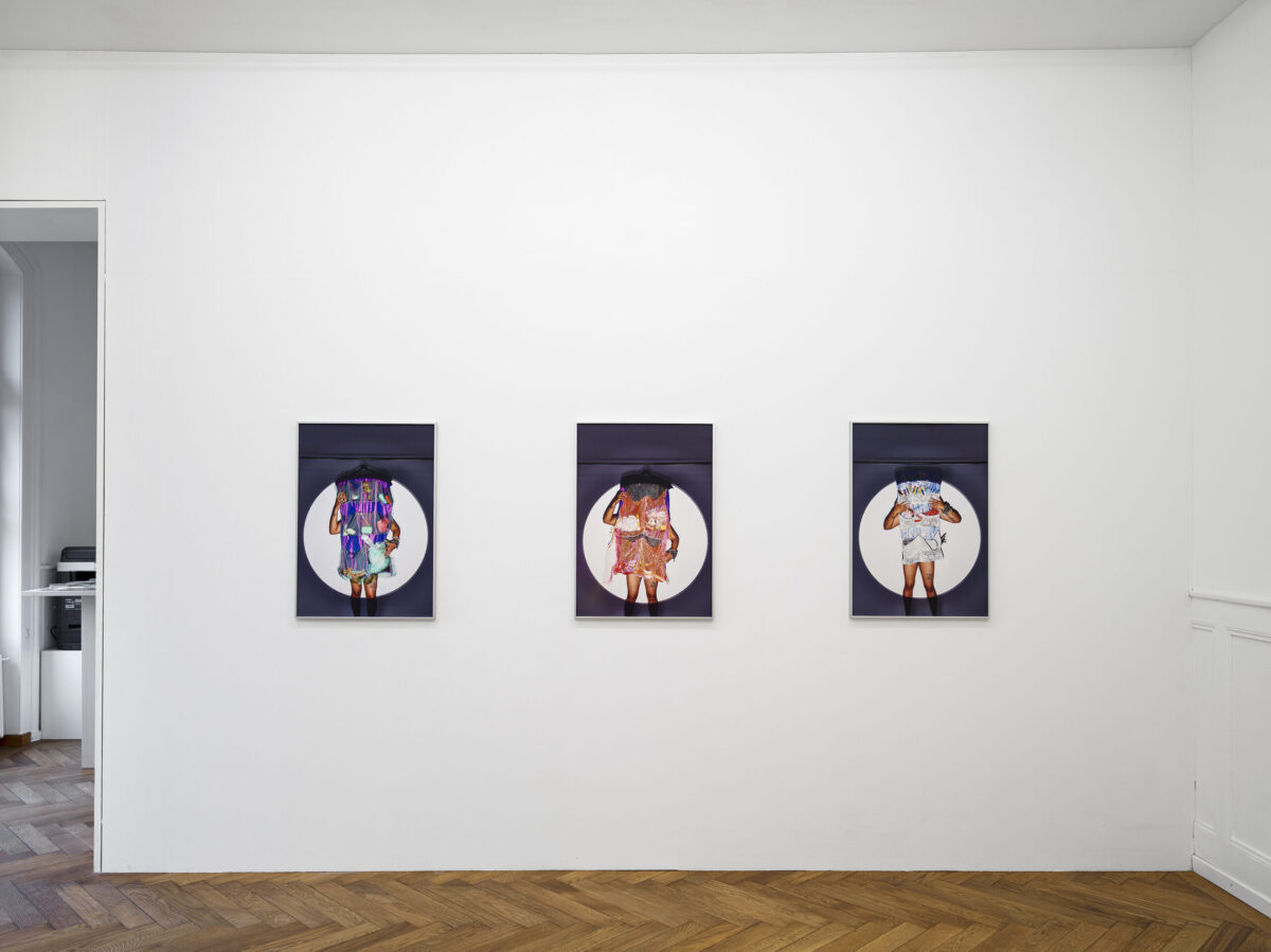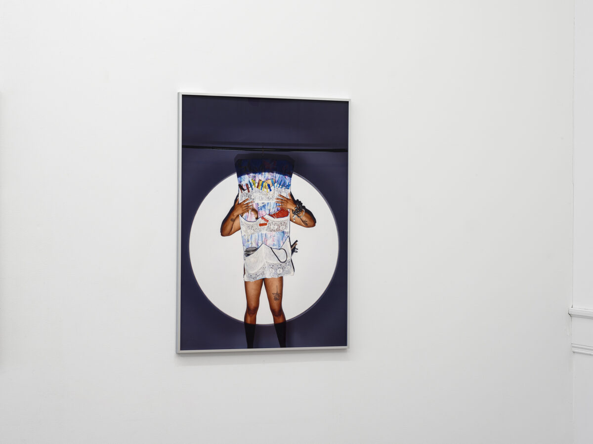 In der fotografischen Inszenierung trägt Rhoda Davids Abel diese Aufbewahrungsbeutel – Kleidungsstücken ähnlich – vor ihren Körper gehängt. Die Gesten ihrer Hände changieren zwischen zärtlicher Berührung, Halt und Pose. Mit dem kreisrunden Scheinwerferkegel thematisiert sie einerseits den performativen Akt des Tragens dieser Objekte und andererseits die Repräsentation Schwarzer Körper sowie deren ambivalente Wahrnehmung in der Öffentlichkeit zwischen Hypersichtbarkeit und Unsichtbarmachung. Auseinandersetzungen rund um die Transformation des eigenen Körpers in einen Bühnenkörper verhandelt Rhoda Davids Abel auf spielerische Weise ebenso wie die Beziehungen zwischen Menschen und ihren Dingen: Wo verläuft die Grenze zwischen mir und dem Gegenüber? Zwischen Menschlichem und Nicht-Menschlichem? Wie bieten uns Gegenstände, die wir mit uns herumtragen, ein temporäres Zuhause? Und wie lassen sich Erfahrungen von Segregation, Migration, Fremdsein und Zugehörigkeit konservieren?
