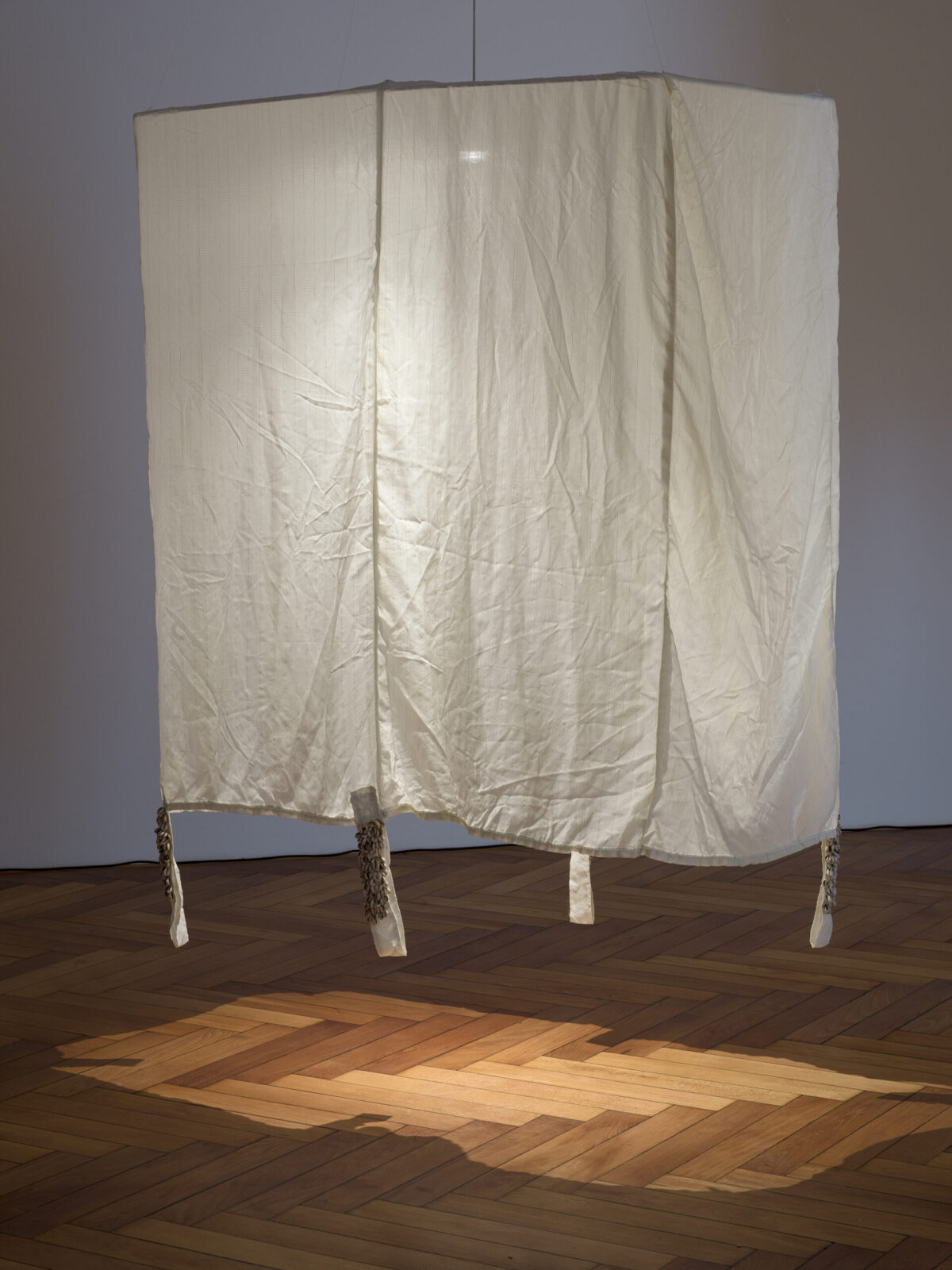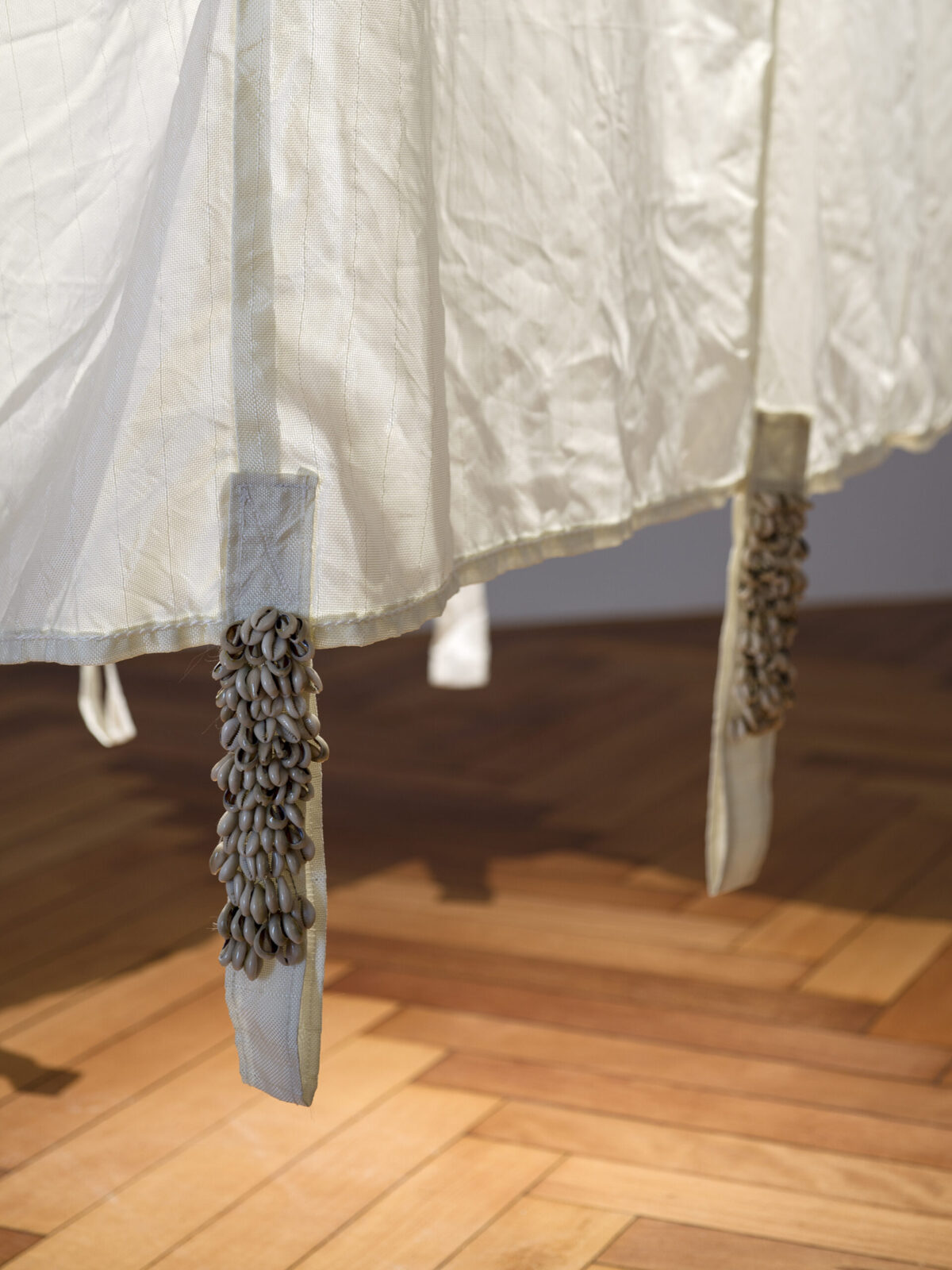 Viele von RHODA DAVIDS ABELS Arbeiten haben ihren Ursprung in Träumen, Familiengeschichten und mythologischen Erzählungen. Die schwebenden textilen Objekte Bittergoet/Bitter Things basieren auf einem Traumbild Davids Abels; ein älterer Herr mit einer Ziege an seiner Seite. Im Zuge ihrer biografischen Nachforschungen erfuhr Rhoda Davids Abel, dass ihr tansanischer Urgrossvater Ziegen- und Schafhirte war. Unter den Hirten existierte der mündlich überlieferte Mythos von Ziegen, die in Form von Wolken übers Land reisten und als Überbringer von Nachrichten agierten. In der Verschmelzung von Tatsachenbericht und magischem Denken überträgt die Künstlerin das Bild der Ziegen-Wolke auf riesige, illuminierte Postsäcke; diese werden zum metaphorischen Behältnis der Informationsvermittlung. Die Laschen an den offenen Enden der Säcke sind mit unterschiedlichen symbolisch aufgeladenen Objekten bestickt – Kaurischnecken, kleinen Glöckchen, und den Deckeln und Verschlüssen von Aludosen. Diese werden von spirituellen Heiler*innen um die Knöchel getragen und begleiten als Rhythmusinstrumente ihre rituellen Tänze.