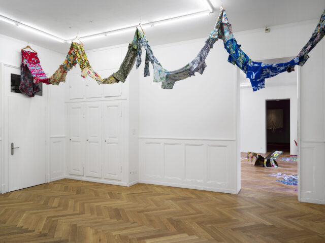 In der Installation Build me up von SERGIO ROJAS CHAVES finden sich textile Scherenschnitte in satten Farben, über Kunststoffstrukturen drapiert oder zu Stapeln aufgehäuft. Sie wecken Assoziationen zu den Abfallbergen von Kleidungsstücken in der Atacama-Wüste, wo die Reste der Überproduktion von Fast Fashion landen. Die an Möbelstücke erinnernden Strukturen aus Acrylglas schaffen Bezüge zu wiederkehrenden Trends aus dem Möbeldesign der 1990er Jahre. Die damit assoziierte minimale, moderne Ästhetik wurde von IKEA aufgenommen, in günstiger Massenproduktion und zum DIY-Zusammenbau für die breite Masse zugänglich gemacht. Der Möbelproduzent bietet neben Dekorationsartikeln auch tropische Zimmerpflanzen an, die ebenso leicht zu kaufen, entsorgen und zu ersetzen sind. Umrisse solcher Pflanzen, die in Ländern des globalen Südens heimisch sind und bei uns ein Dasein in Innenräumen fristen, hat Sergio Rojas Chaves aus Textilien mit tropischen Motiven von Pflanzen, Blumen und Vögeln ausgeschnitten. Die Scherenschnitte scheinen sich auf den Möbelstücken auszuruhen, als wäre ihre dekorative Funktion erschöpft und sie den Trends der Innenarchitektur ausgeliefert. Mit Build me up greift Sergio Rojas Chaves die Kurzlebigkeit und Austauschbarkeit bestimmter Motive und Vorstellungen auf, aber auch konkreter Dinge wie Kleidung, Inneneinrichtung oder Zimmerpflanzen. Die konstante Verfügbarkeit all dieser Dinge lässt uns vergessen, woher sie kommen, welche Wege sie zurückgelegt haben, wohin sie gehen, wenn wir sie aussortieren und entsorgen.