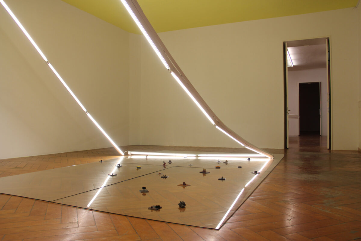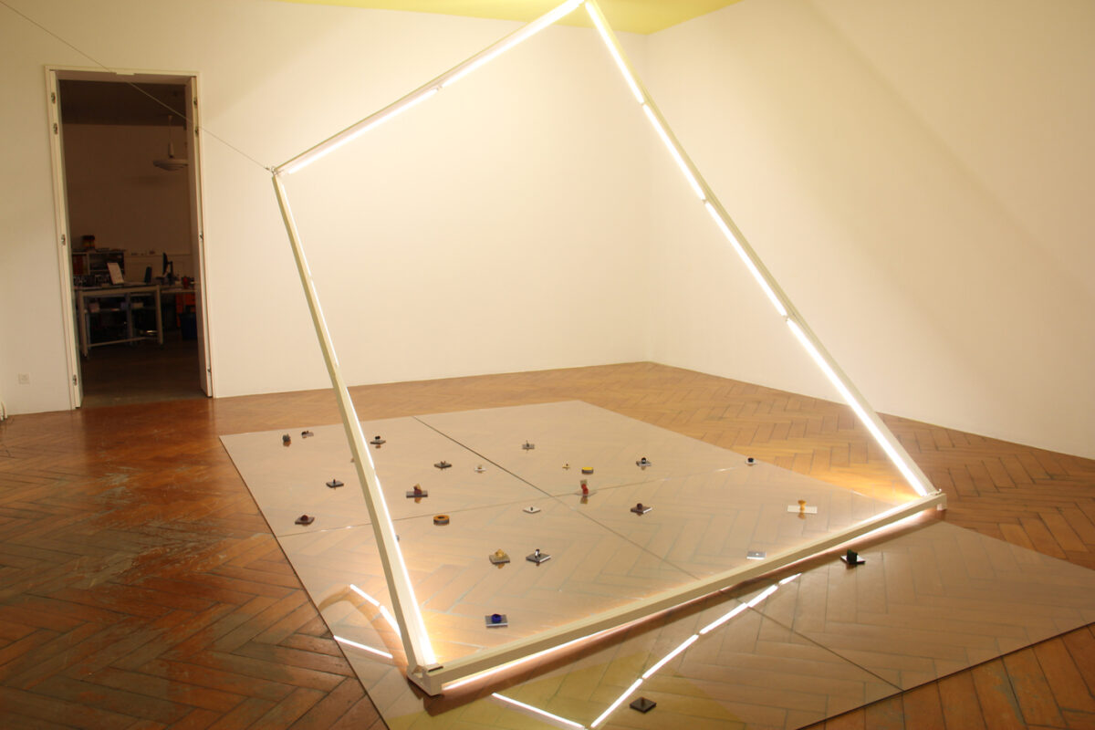Anja Brauns Arbeit zieht die Aufmerksamkeit sofort auf die Konstruktion der Leuchtstoffröhren. Normalerweise dient diese, als rechteckige, regelmässige Anordnung an der Decke, zur Beleuchtung der Ausstellung. Die Konstruktion, nun fast frei schwebend, wird plötzlich zu einem Lichtkörper, der durch seine Grösse und Leuchtkraft eine starke, fast bedrohliche Präsenz im Raum behauptet und das Raumvolumen mit einer Diagonalen durchbricht. Auch die Behandlung der Decke mit reinem Nickeltitangelb und die grosse, rechteckige Glasfläche, welche den Raum als Spiegelung zurückwirft, sind klare ästhetische Gesten, welche unmittelbar beim Betreten des Raumes erfahren werden.