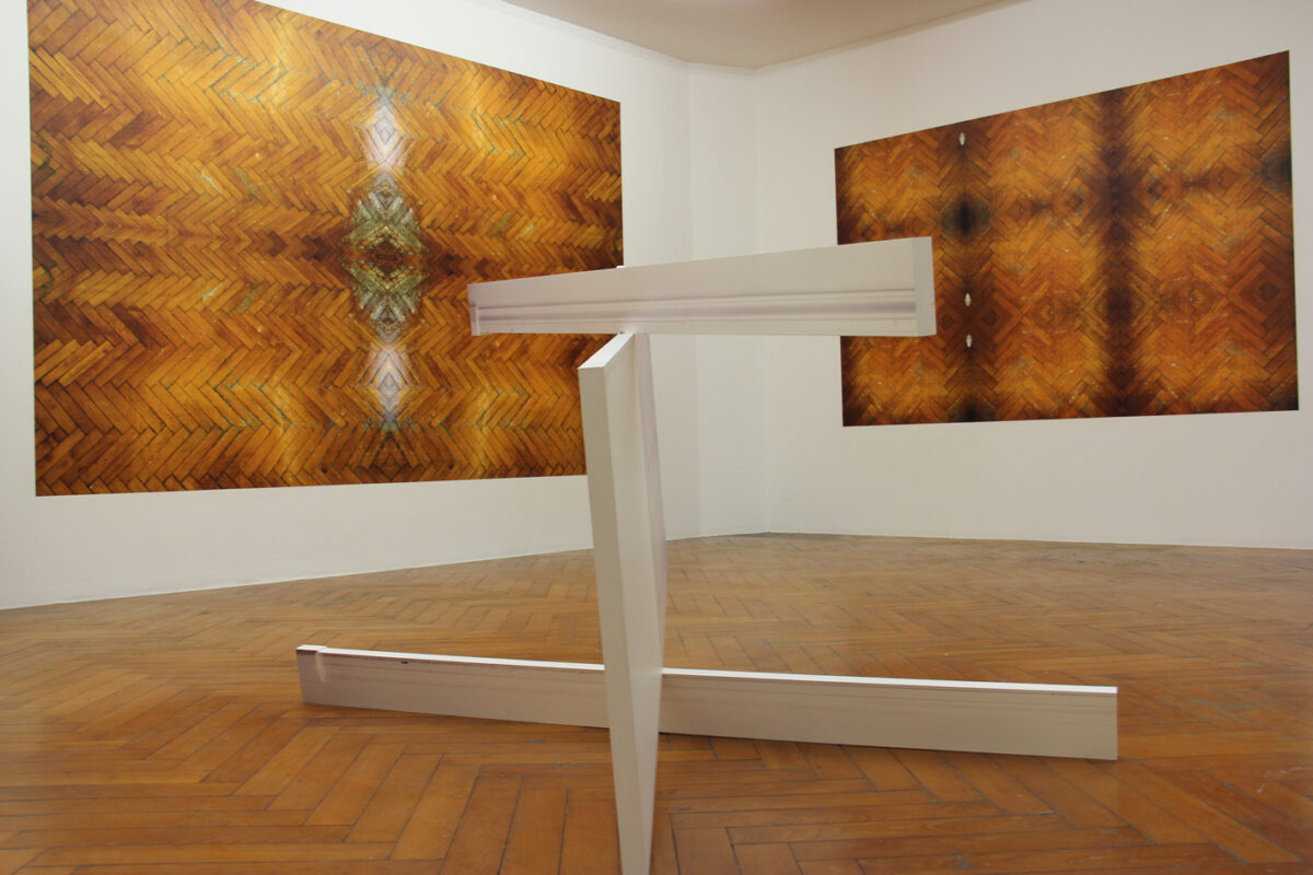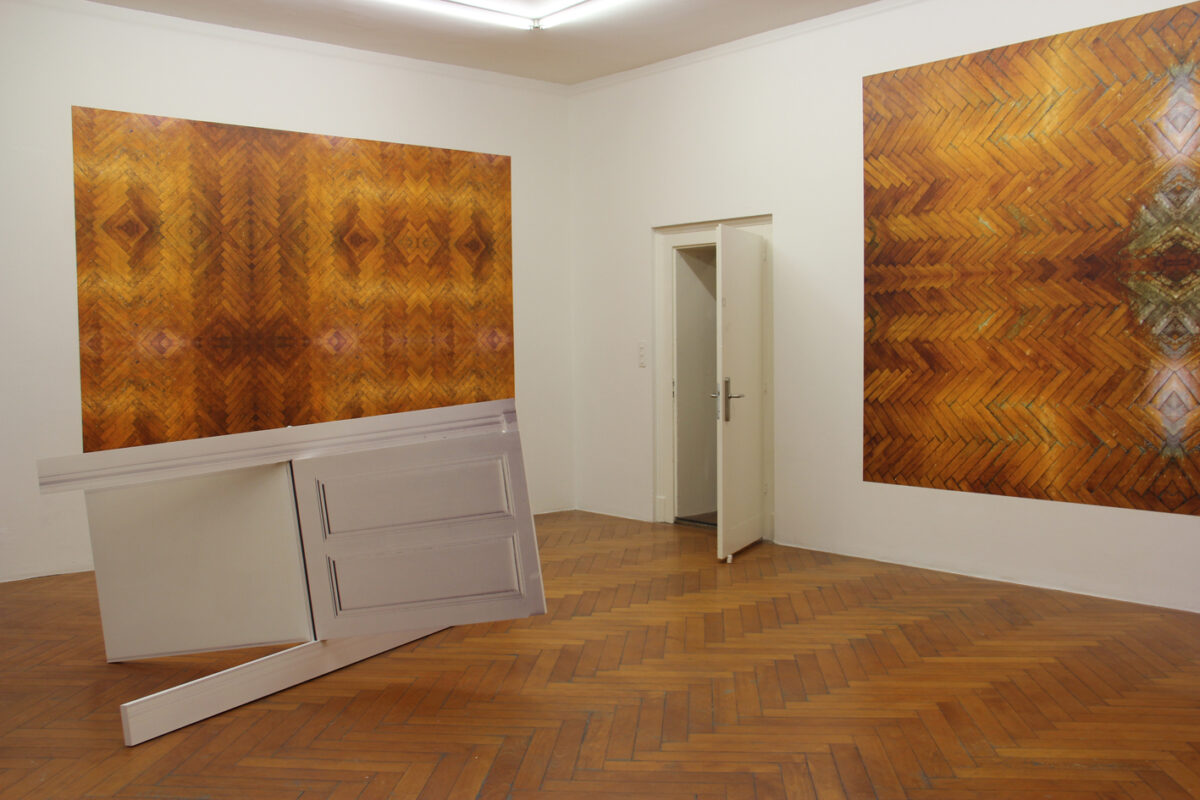 Weiter fotografierte Yvonne Mueller Ausschnitte des Parkettbodens. Mittels digitaler Spiegelung und Vervielfachung entstanden neue Bilder. Diese verwendet sie für die grossflächige Tapezierung der Wände. Durch die Oberflächenstruktur, die Spuren der vergangenen Zeit und den angesammelten Schmutz erhalten die Bilder ornamentale Qualität und erinnern an Wandteppiche. Der Boden, eigentlich der Träger der betrachtenden Person, gewinnt als Abbildung in vertikaler Lage eine erhöhte Wichtigkeit. Die Arbeiten sensibilisieren die Wahrnehmung und lenken die Aufmerksamkeit auf reale Elemente im Raum zurück.