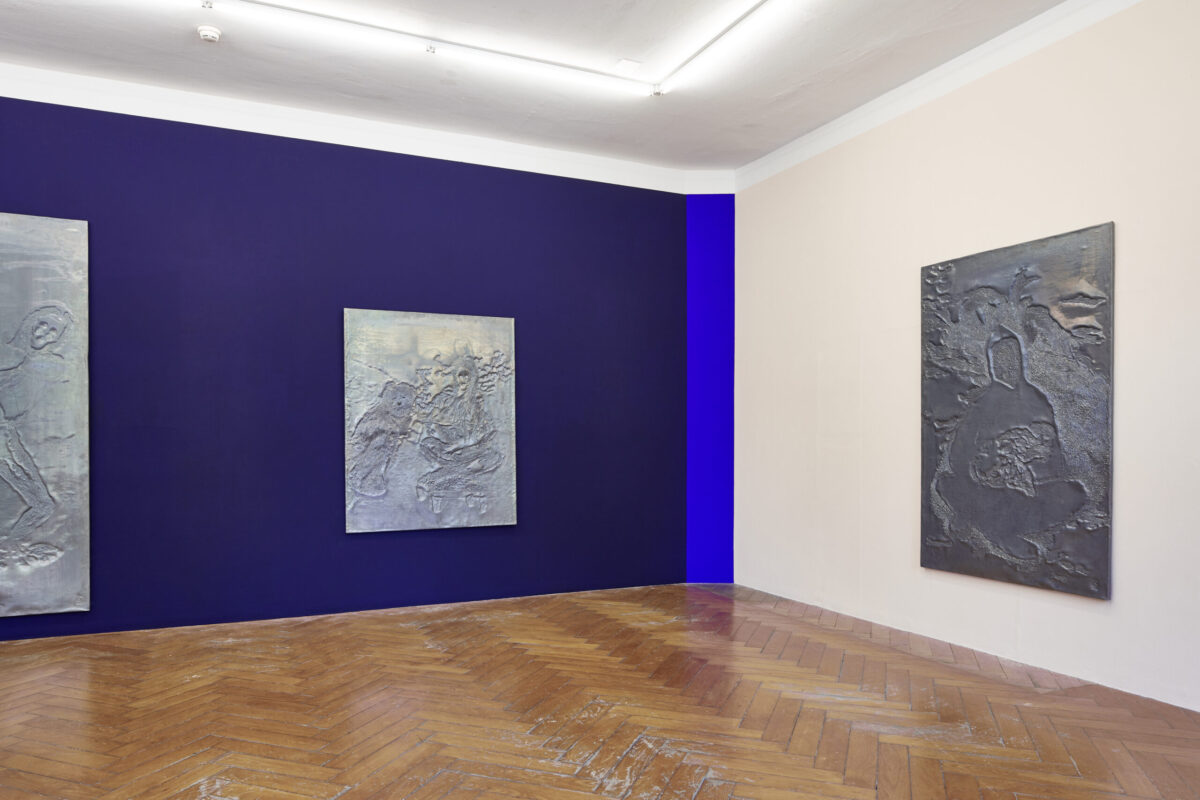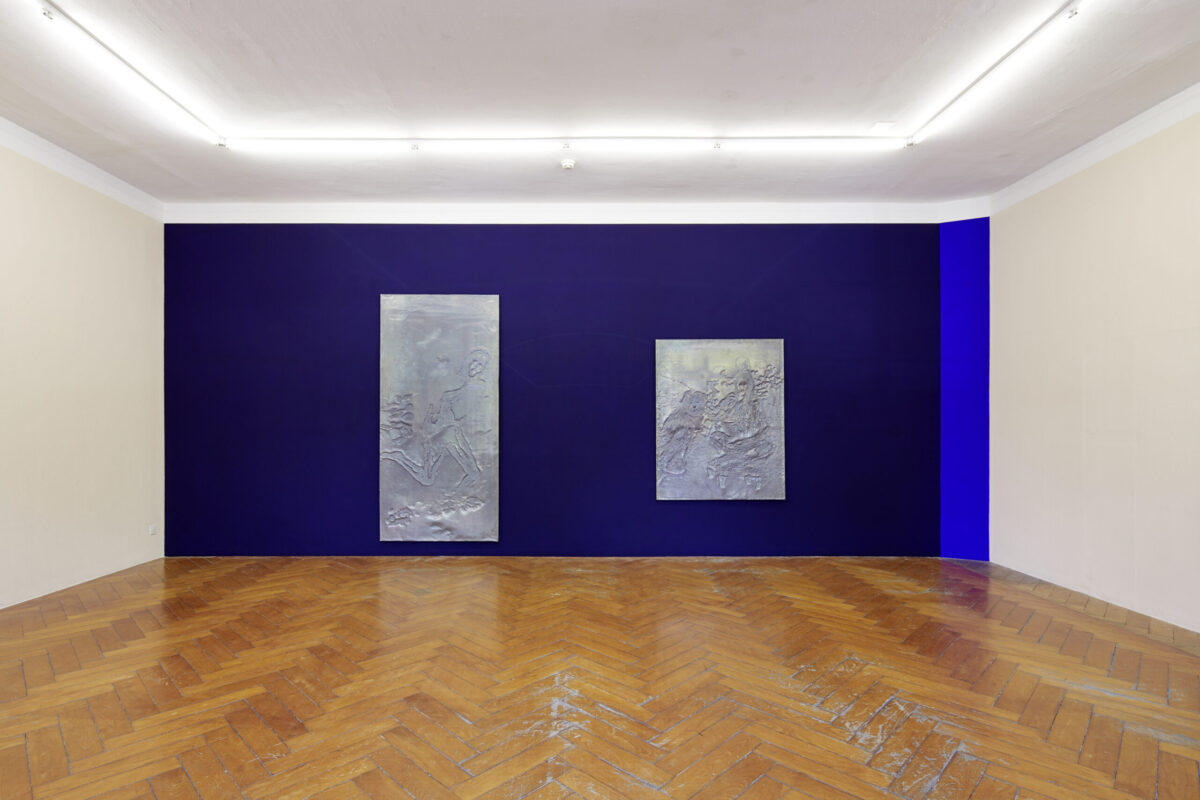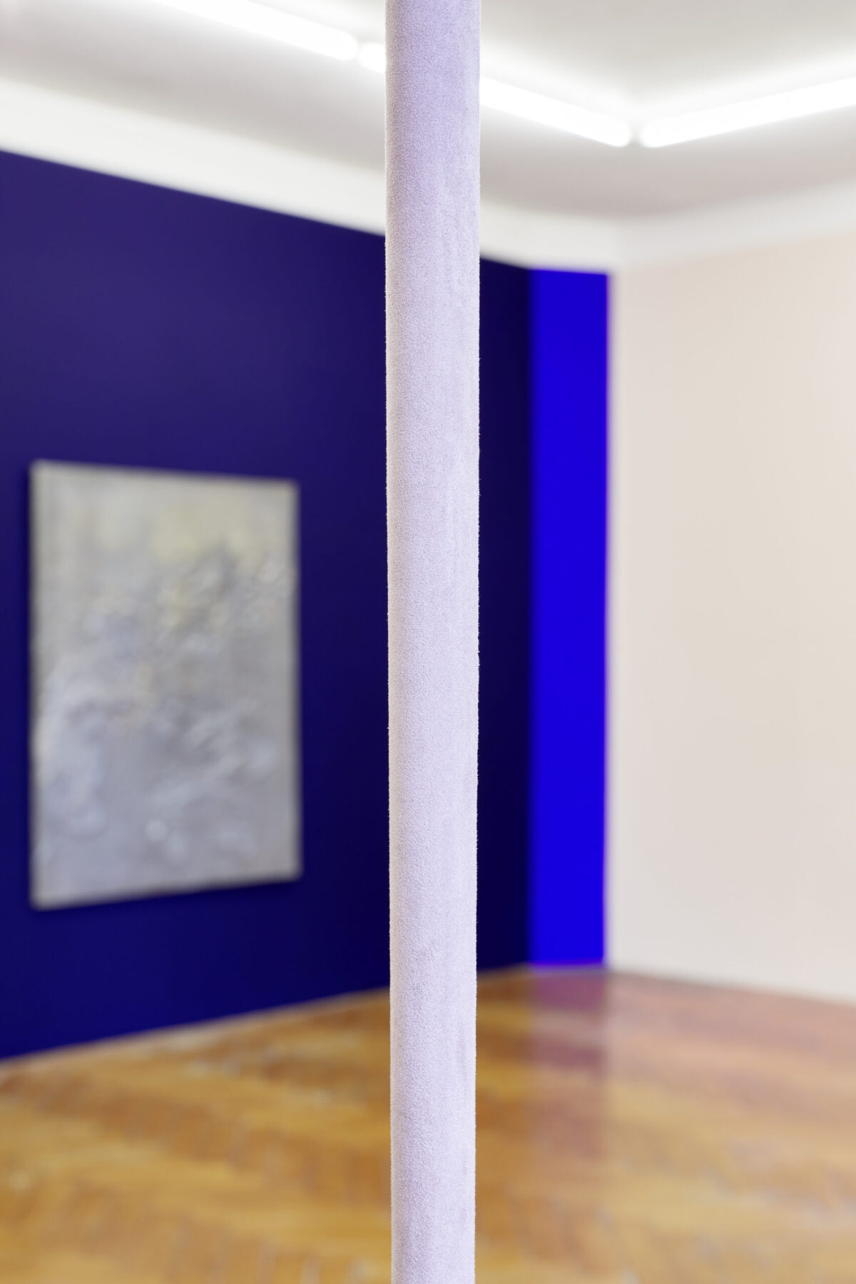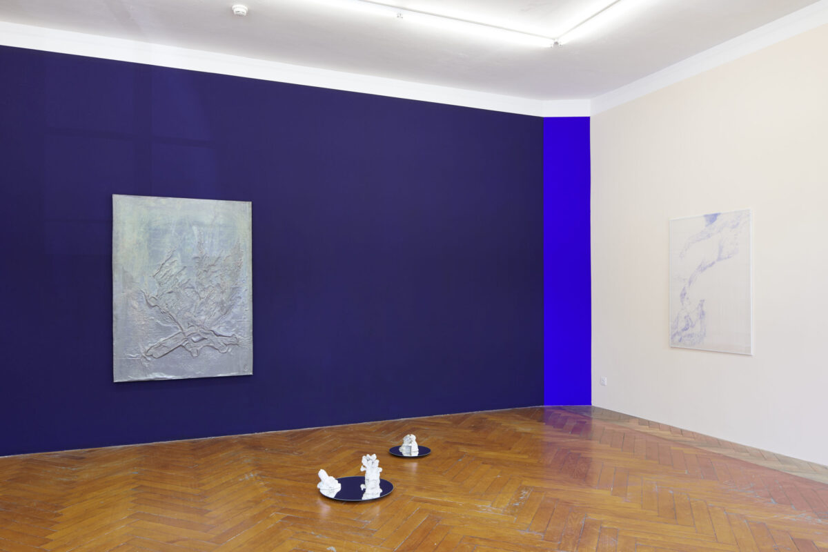 Die hochpigmentierten Farben auf den Wänden sind bewusst eingesetzt. Sie leiten sich aus Farbnuancen der Bleioxidation sowie den in den Seide-Zeichnungen verwendeten Farben ab. In der Spiegelung werden sie vervielfacht und lassen eine weitere Zwischenwelt entstehen.