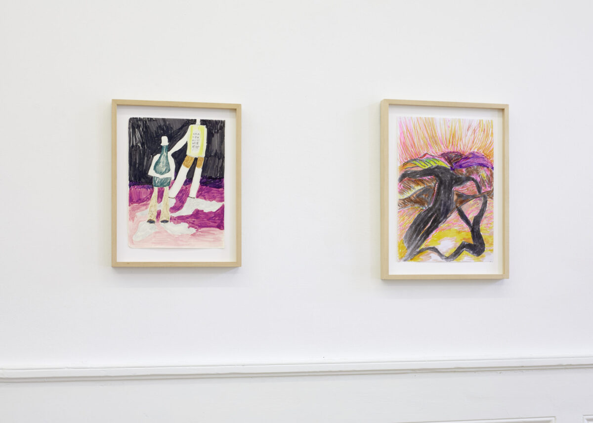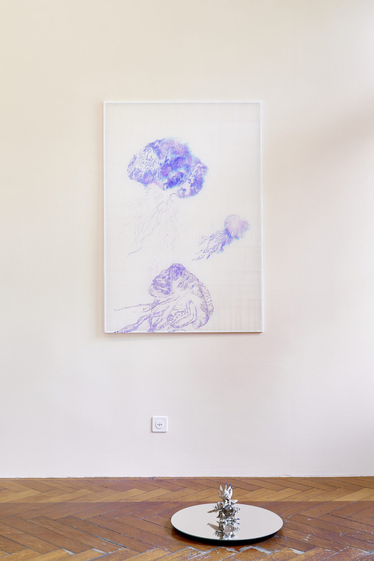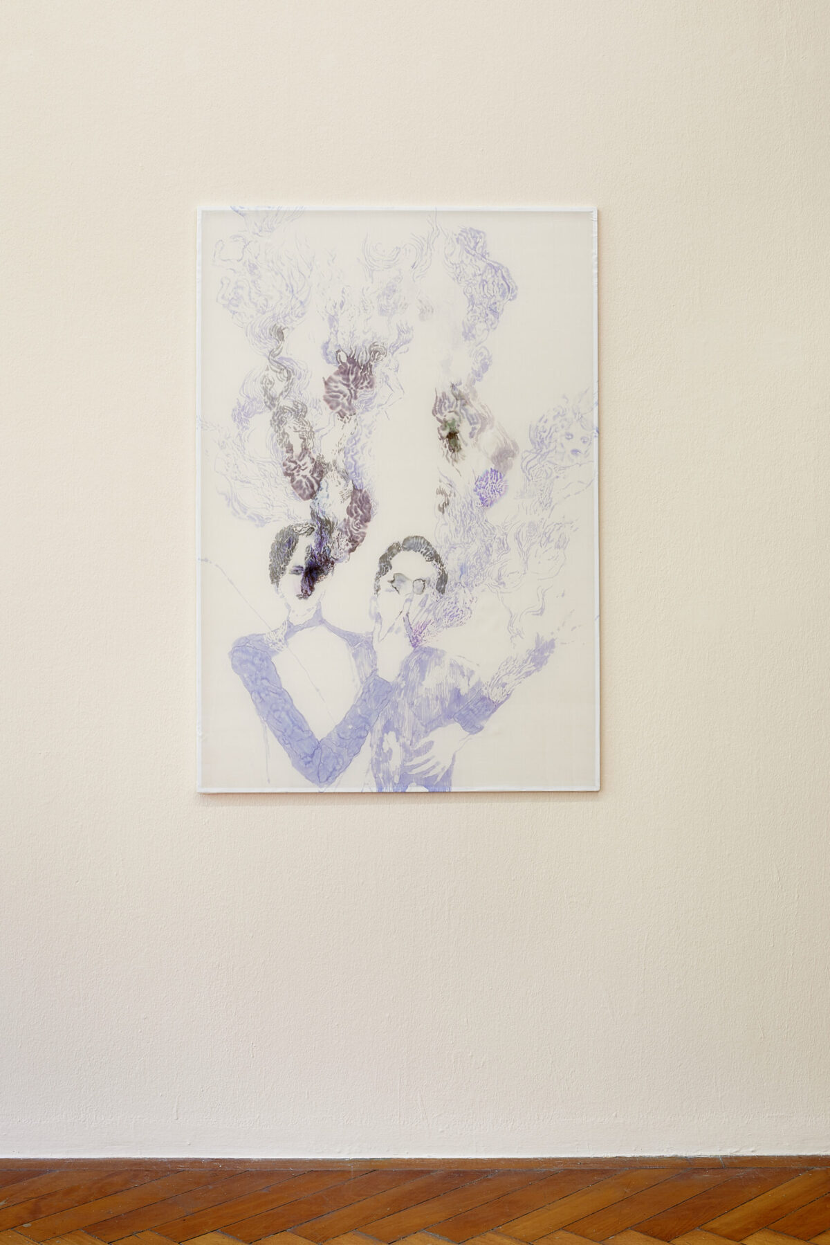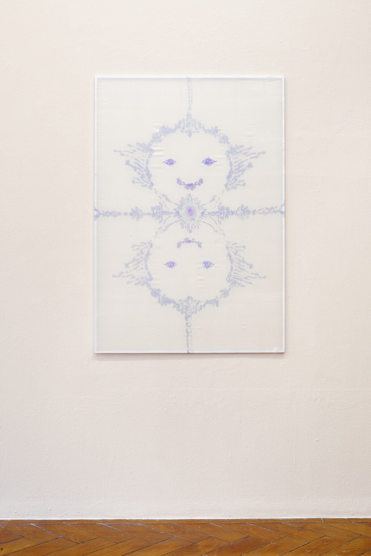 Den Arbeiten wohnen mögliche Anfänge von Geschichten inne, die sich durch die Gegenüberstellungen der Bildwelten innerhalb der Ausstellung weiterspinnen. Die Bildinhalte spielen auf eine feinstoffliche Ebene an und erzählen von geistigen Verbindungen. Immer wieder breiten sich Arme und Haare der Figuren fadenartig aus und werden zu Fühlern unmittelbarer und zukünftiger Begegnungen.