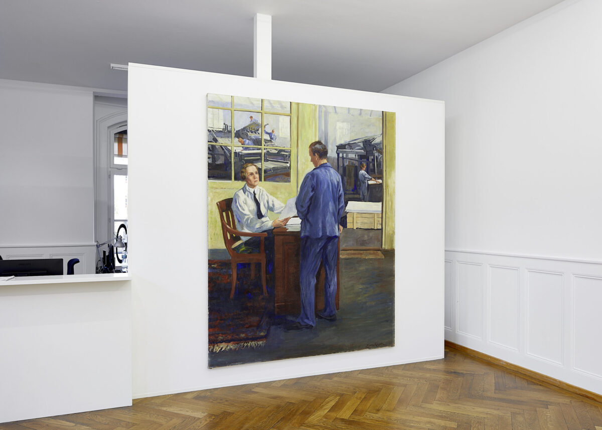 «Auf dem Bild Die Kündigung von ERICA VON KAGER sieht man einen Chef der einem Angestellten kündigt. Sehr wahrscheinlich ist der Chef derjenige, der im weissen Hemd am Pult sitzt und der Arbeiter steht in einem grauen Arbeitsanzug daneben, mit dem Rücken zum Betrachter. Hinter dem Büroraum geben ein Fenster und ein offener Durchgang den Blick frei auf einen Produktionsraum mit weiteren Arbeitern und Maschinen. Es könnte sich um eine Druckerei, eine Papier- oder vielleicht Textilfabrik handeln.