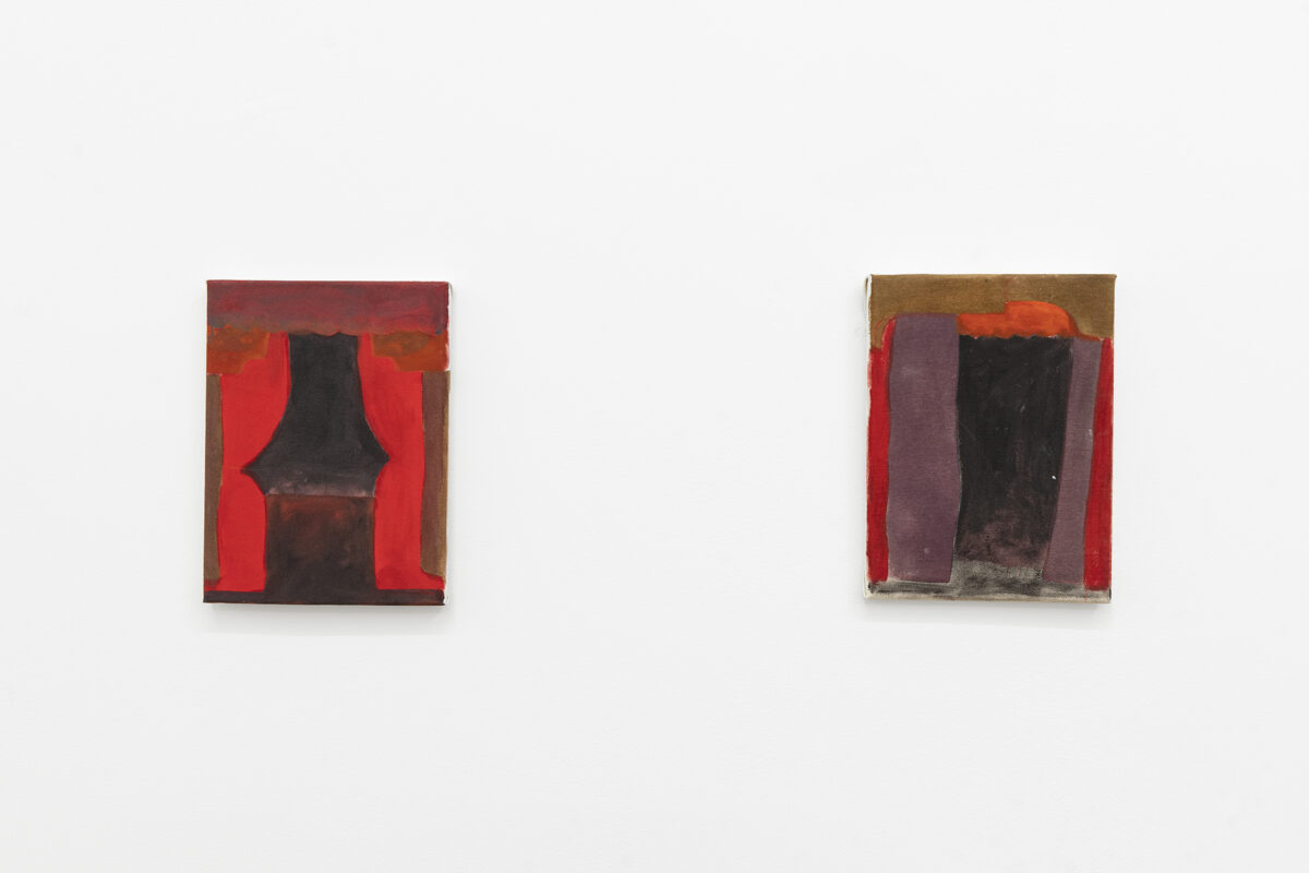 TOBIAS HAUSWIRTH (*1998) richtet seinen Blick auf Räume, die nach Körpern verlangen. Die Vorhänge in seinen Gemälden sind zwar offen, doch hinter ihnen breitet sich nur ein wenig definierter Schattenraum aus. Sie sind hoch und eng, ähneln eher Pforten und geben damit nur bedingt einen Blick hinter die Kulissen frei. Auf einen Auftritt zu warten ist hoffnungslos, es bleiben nur die Betrachtenden und die Bühne.
