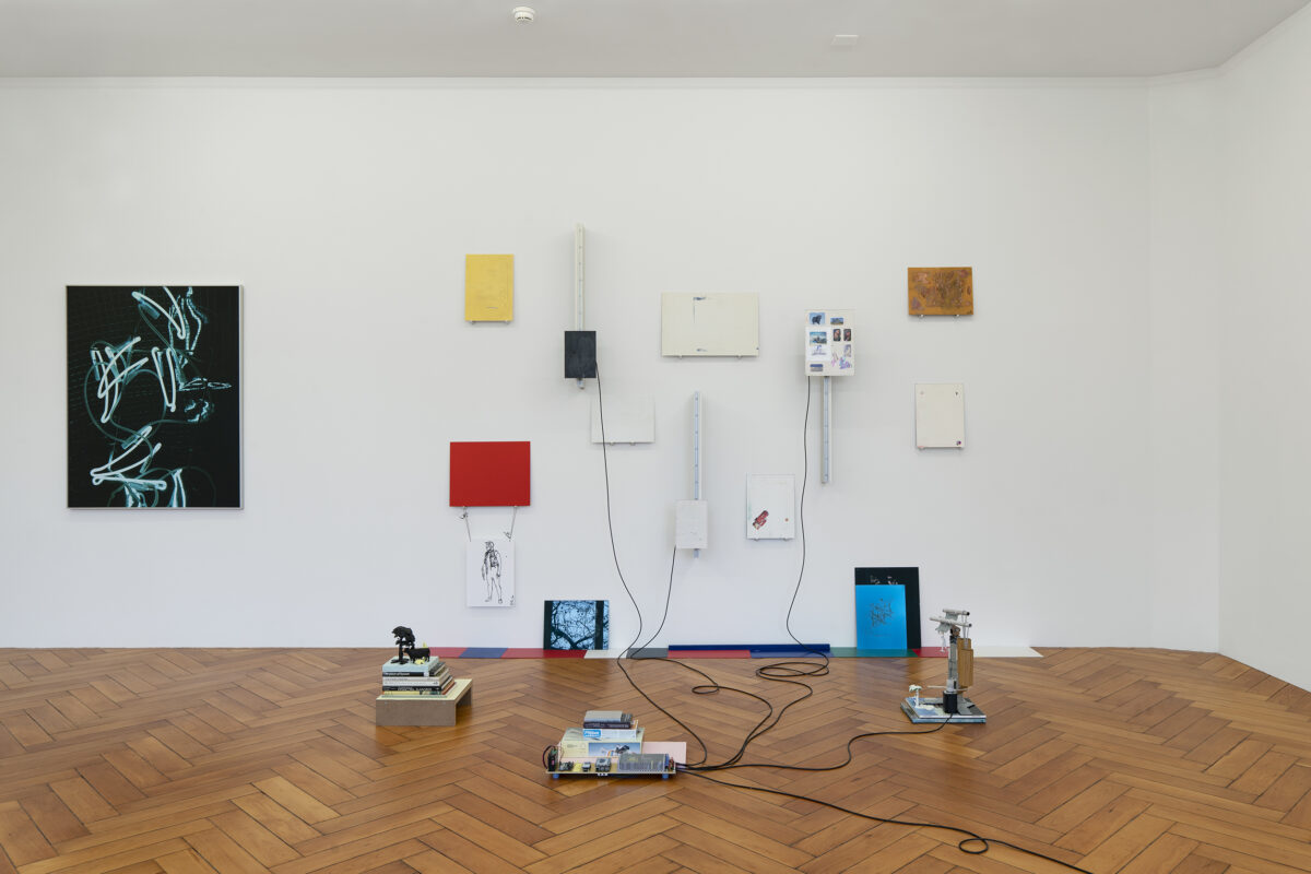 Der aus den Überresten eines alten Schranks gezimmerte Hochspannungsmasten steht mit abgespreizten Armen da, bereit für eine Leibesvisitation, oder als würde er die Zeichnungen die an ihm runterhängen, feilbieten. Entstanden sind die Blätter 2008 während BERNHARD HEGGLINS (*1989) Studium in Bern, beeinflusst durch die Räumlichkeiten des ehemaligen Standorts der HKB im Primarschulhaus Enge-Felsenau. Ten Years (2018) umfasst jene Zeitspanne einer Künstler*innenlaufbahn, die wie keine andere mit Erwartungen überladen ist. Die Skulptur kehrt diese Narration um, und wie in anderen seiner Arbeiten wird sie zum Witz ohne Pointe, die einen mit dem Gefühl des Unaufgelösten und der Beklemmung zurücklässt.