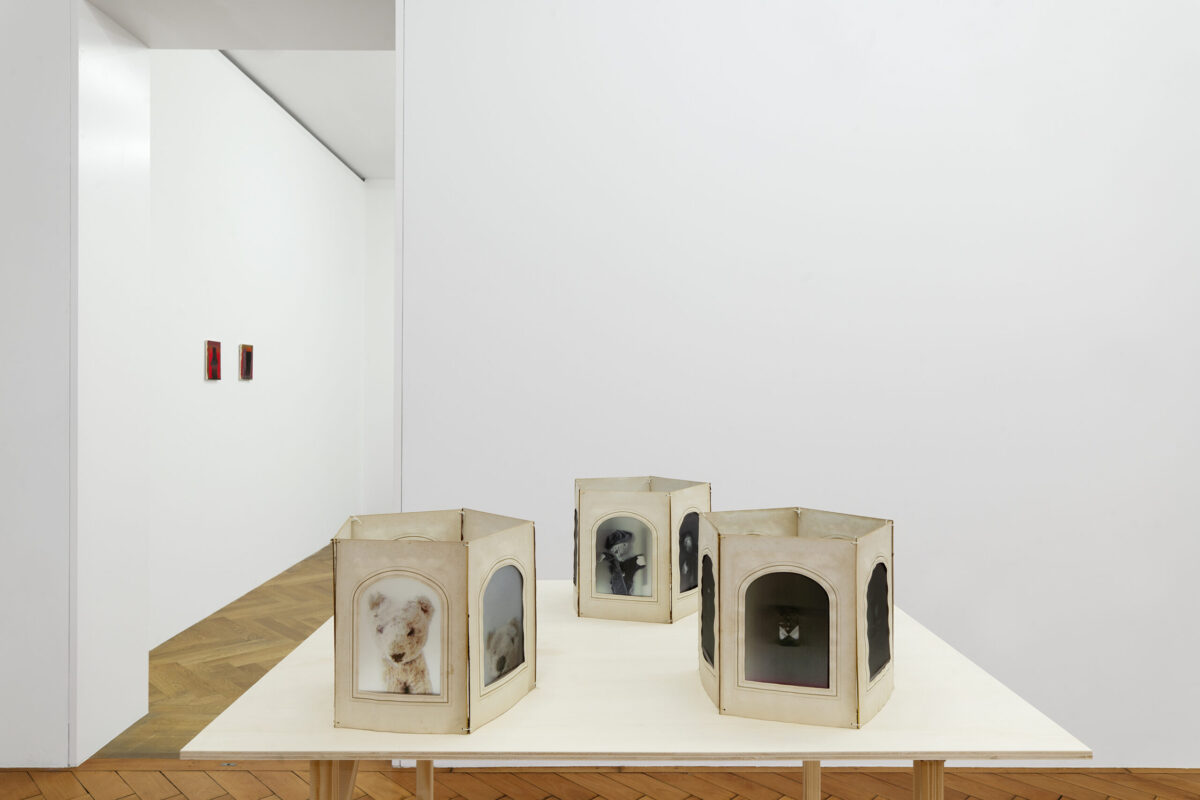 Die drei kleinen Gruppen von URSULA WEIDMANN (*1955) lassen in ihrer Stille viel Imagination zu. So schauen die portraitierten Stofftiere in Souvenirs – dass es Tiere weit weg gibt (2019–2020) sich gleichzeitig konspirativ gegenseitig an als auch aus ihrem Kreis hinaus. Durch die mediale Verschiebung der unterschiedlichen Spielzeuge bekommen diese eine zusätzliche ephemere Qualität und werden je nach Leseart zu Laternen, Karussellen oder Séancen arrangiert, die gleichzeitig hochgradig spezifisch wie archetypisch erscheinen.