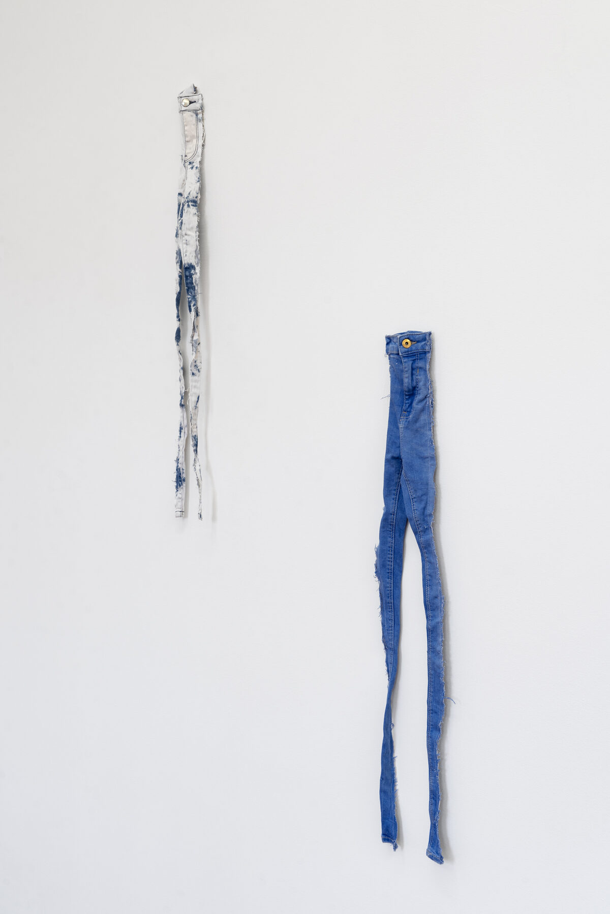 Mit Spaghetti Jeans Series: Pants for the Man on the 100 CHF Bill (2020) treibt ERNESTYNA ORLOVSKA (*1987) Körper- und Fashionkultur auf die Spitze: Schlanker und enger, bis die Kleidung nach der abstrakten Silhouette einer Alberto Giacometti-Skulptur verlangt. Der früher unverwüstliche Denimstoff, heute zu einem Inbegriff von Fast Fashion geworden, wird hier noch weiter beschleunigt. Genäht aus den Abschnitten anderer Kostümprojekte werden die Jeans zu ihren eigenen Entitäten und greifen über die menschlichen Begrenzungen hinaus in einen transhumanistischen Raum.