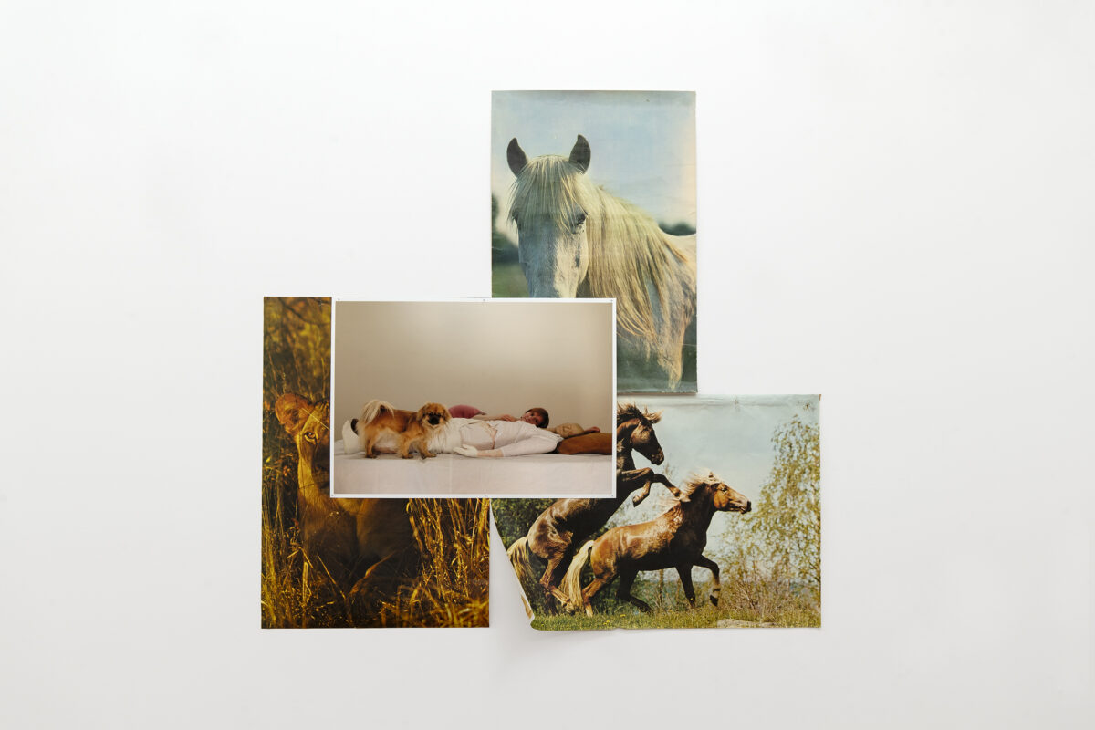 Mélange_Teil 1_Wallach_etc (1975-2019) ist Teil einer Werkserie von HANNAH KÜLLING (*1965) in der sie Materialien aus ihrem eigenen Archiv miteinander kombiniert. Die Tierposter aus dem Kinderzimmer von 1975 umrahmen dabei ein Selbstbildnis, das die Künstlerin mit einer Skulptur von Hannah Goll, ihrem Alter Ego zeigt. Die liegende Figur war bereits 2012 in der Stadtgalerie zu Gast und wurde 2020 für eine andere Arbeit aufgelöst. Bilder aus der persönlichen und öffentlichen Erinnerung vermischen sich, und obgleich sie immer nur vergangene Zustände abbilden können, besteht immer die Verlockung, aus den Eindrücken eigene Schlüsse zu ziehen.