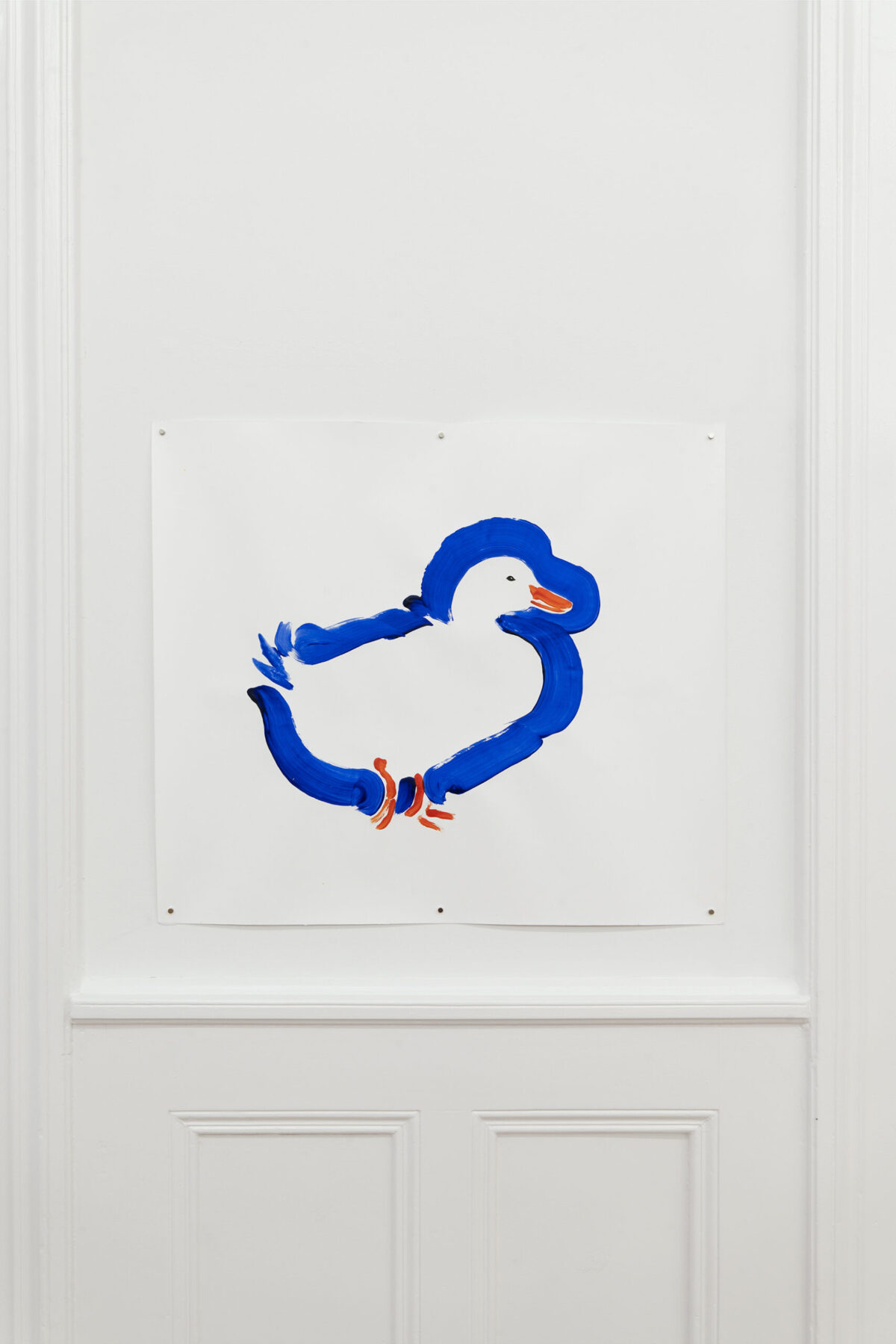 PAUL HUTZLI (*1992) spielt mit den Konventionen von Zeichnung und Malerei. Seine Arbeit Peckin Duck (2020) erscheint mühelos in ihrem Aufbau, lässt die konzentrierte Intention aber erahnen. Basierend auf einem persönlichen Vokabular nimmt die beinahe kalligraphierte Ente Bezug auf klassische Naturdarstellungen und karnevaleskes Handwerk, ohne eine Tradition in ihrer Wertigkeit über die andere zu stellen.