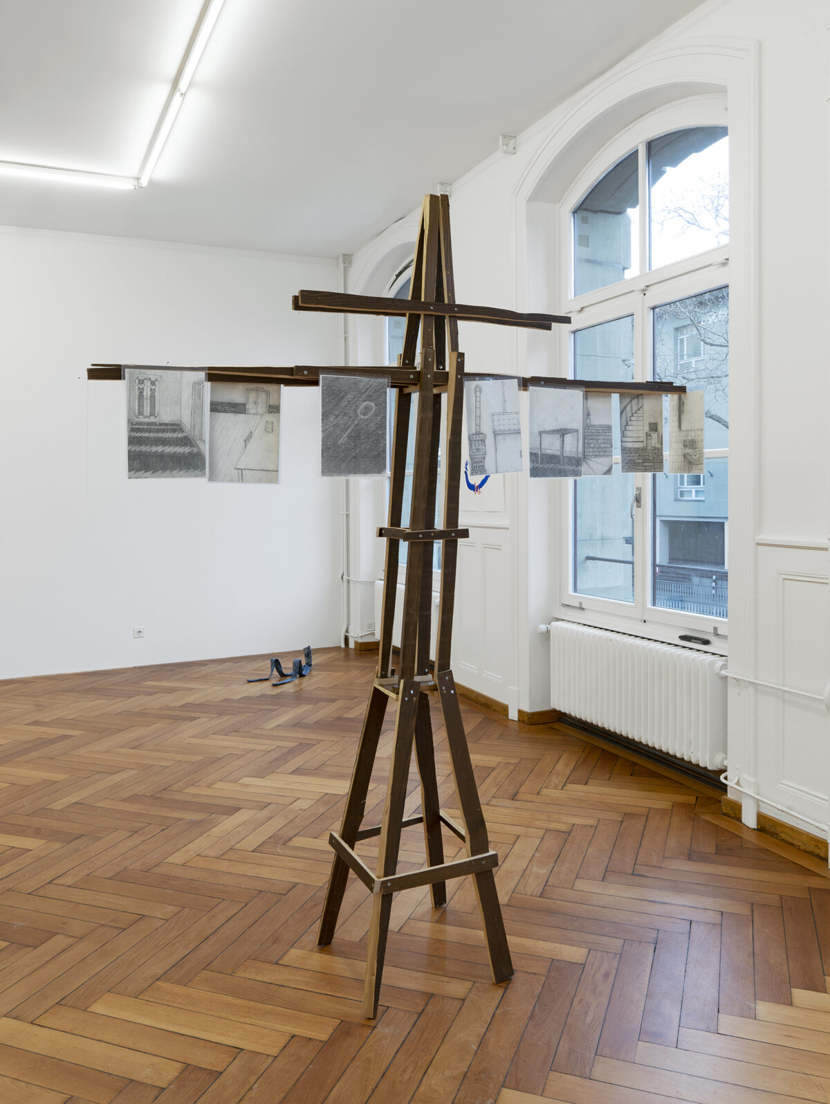 Der aus den Überresten eines alten Schranks gezimmerte Hochspannungsmasten steht mit abgespreizten Armen da, bereit für eine Leibesvisitation, oder als würde er die Zeichnungen die an ihm runterhängen, feilbieten. Entstanden sind die Blätter 2008 während BERNHARD HEGGLINS (*1989) Studium in Bern, beeinflusst durch die Räumlichkeiten des ehemaligen Standorts der HKB im Primarschulhaus Enge-Felsenau. Ten Years (2018) umfasst jene Zeitspanne einer Künstler*innenlaufbahn, die wie keine andere mit Erwartungen überladen ist. Die Skulptur kehrt diese Narration um, und wie in anderen seiner Arbeiten wird sie zum Witz ohne Pointe, die einen mit dem Gefühl des Unaufgelösten und der Beklemmung zurücklässt.