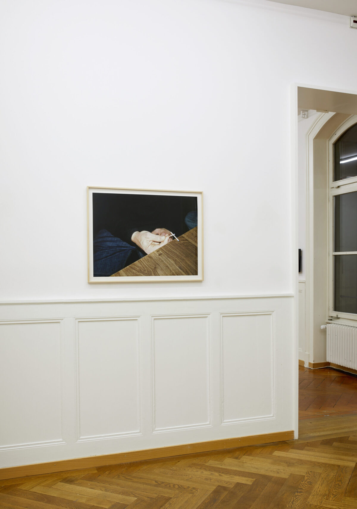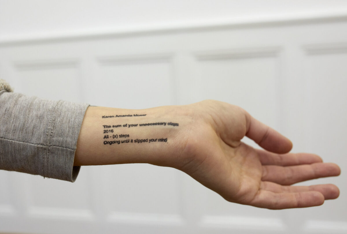 Die Arbeit von KAREN AMANDA MOSER (*1988 in Thun, lebt und arbeitet in Antwerpen und Bern) besteht aus ihrem Titel The sum of your unnecessary steps (2016), der sich als Stempeldruck auf dem Handgelenk der Besucher manifestiert. Die Zeitlichkeit und der Ort verschieben sich dabei mit der Person die den Stempel trägt, er begleitet sie während und nach der Ausstellung bis die Farbe verblasst. Auch der Inhalt der Arbeit ergibt sich für jede Person anders, abhängig von der eigenen Definition und Aufmerksamkeit sammeln sich unter dem Titel alle als unnütz empfundenen Schritte.