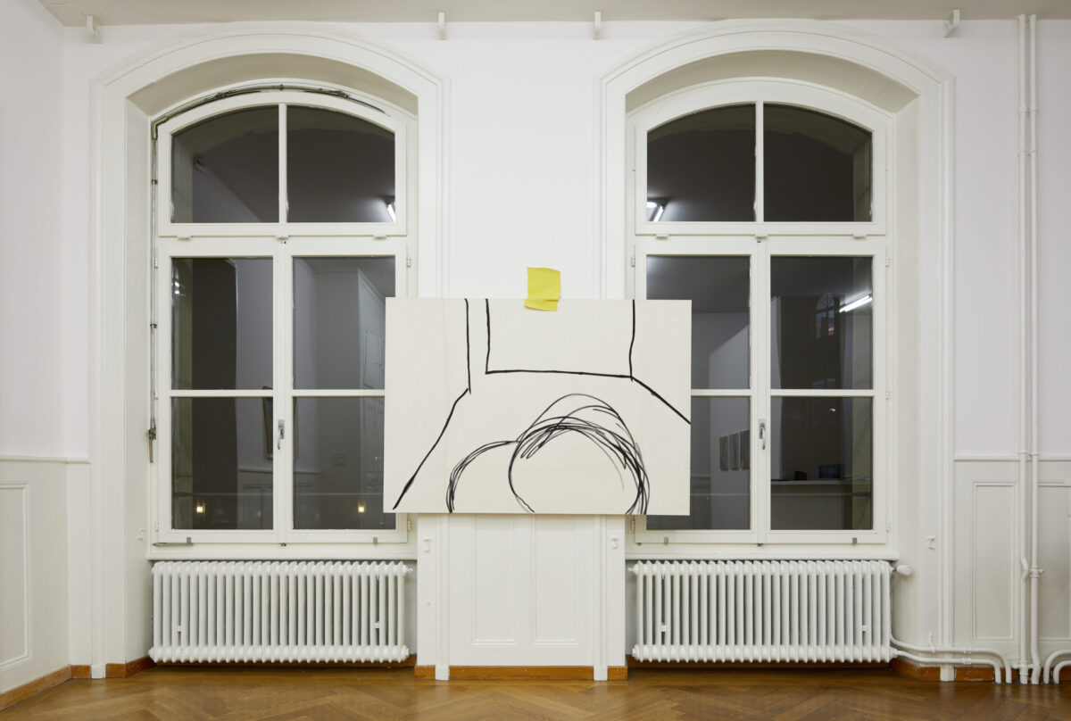IVAN MITROVIC (*1985 in Basel, lebt in Basel und arbeitet in Ostermundigen) nutzt als Vorlagen für seine Malerei Kritzeleien von Notizzetteln, die er bei Freunden oder auf der Strasse findet. Der Künstler interessiert sich dabei für den flüchtigen, teils unwichtigen oder unbewussten Charakter solcher Skizzen. Die erste Skizze einer Beziehung ist bei Mitrovics First sketch of a relationship (2016) somit nicht ein romantisches oder idealisiertes Bild, sondern eine spontane und ungekünstelte, vielleicht auch unvermögende Aufzeichnung eines Zustands, der so genau noch nicht festgelegt werden kann. Die aus mehreren Teilen zusammengenähte Leinwand unterstützt dabei die Stimmung eines Beziehungsanfangs, wo zwei Menschen mit ihren Geschichten und Eigenschaften nach und nach zu einem Paar zusammenwachsen.