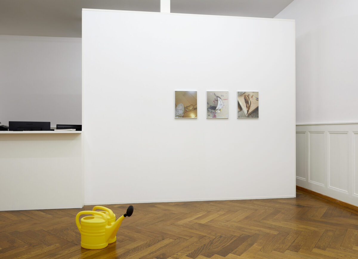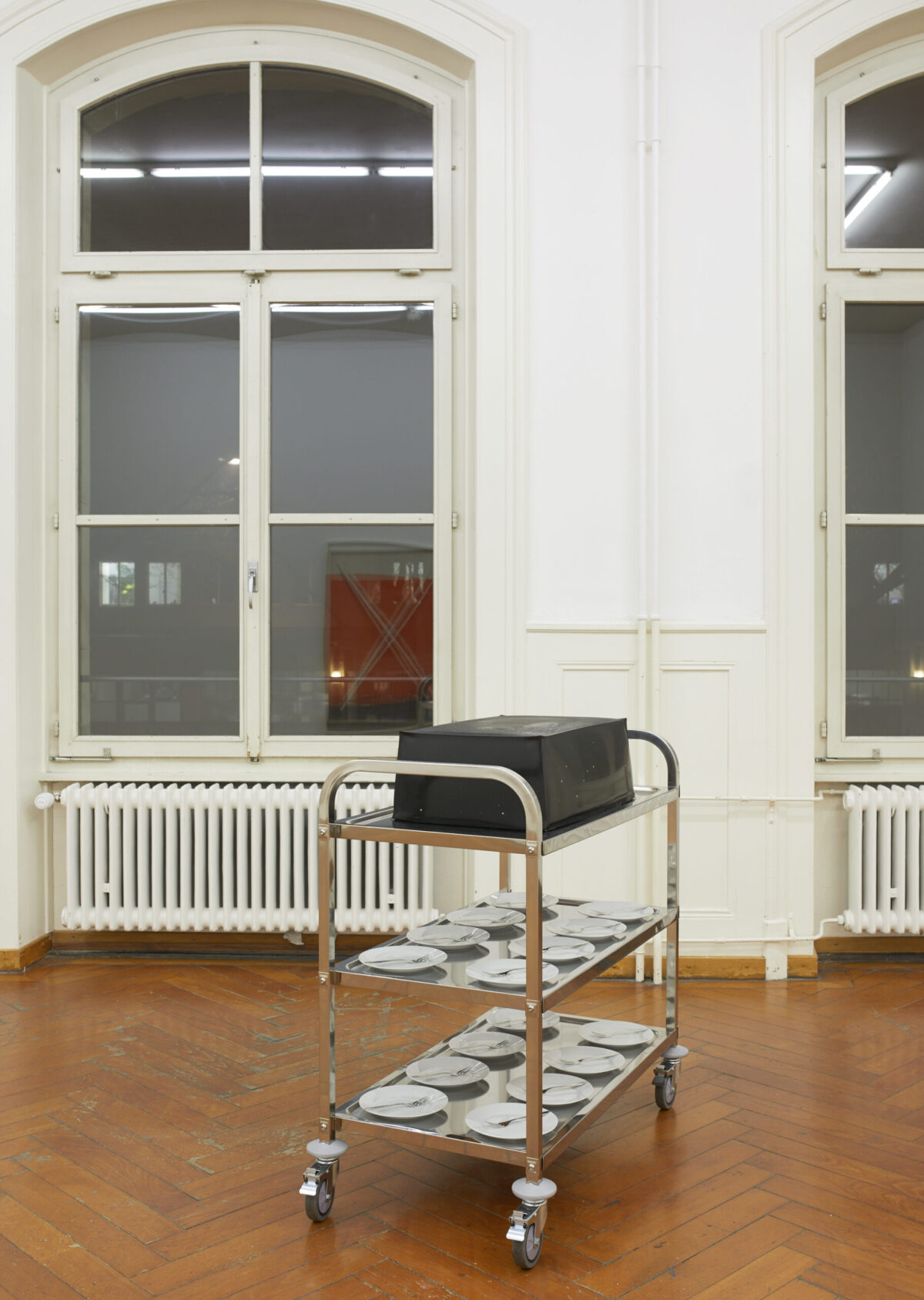 ANDREAS JÄGGI (*1989 in Schaffhausen, lebt und arbeitet in Ligerz) kommentiert mit Yummy Yummy, It‘s Contemporary (2016) den Begriff des Zeitgenössischen mit einem Buffet. Auf einem Servierwagen befinden sich ein grosser schwarzer Gelatineblock und einige sauber angeordnete Teller und Gabeln. Nüchtern, reduziert und unberührt – so könnte man gewisse Kunst beschreiben – wird auch die servierte Gelatine nicht gegessen. Diese zersetzt sich im Laufe der Ausstellung unter Schimmel und Geruchsbildung und dient als Parodie oder Sinnbild dafür, wie jedes Frische und Zeitgenössische seinen Weg in eine Endlichkeit finden kann.