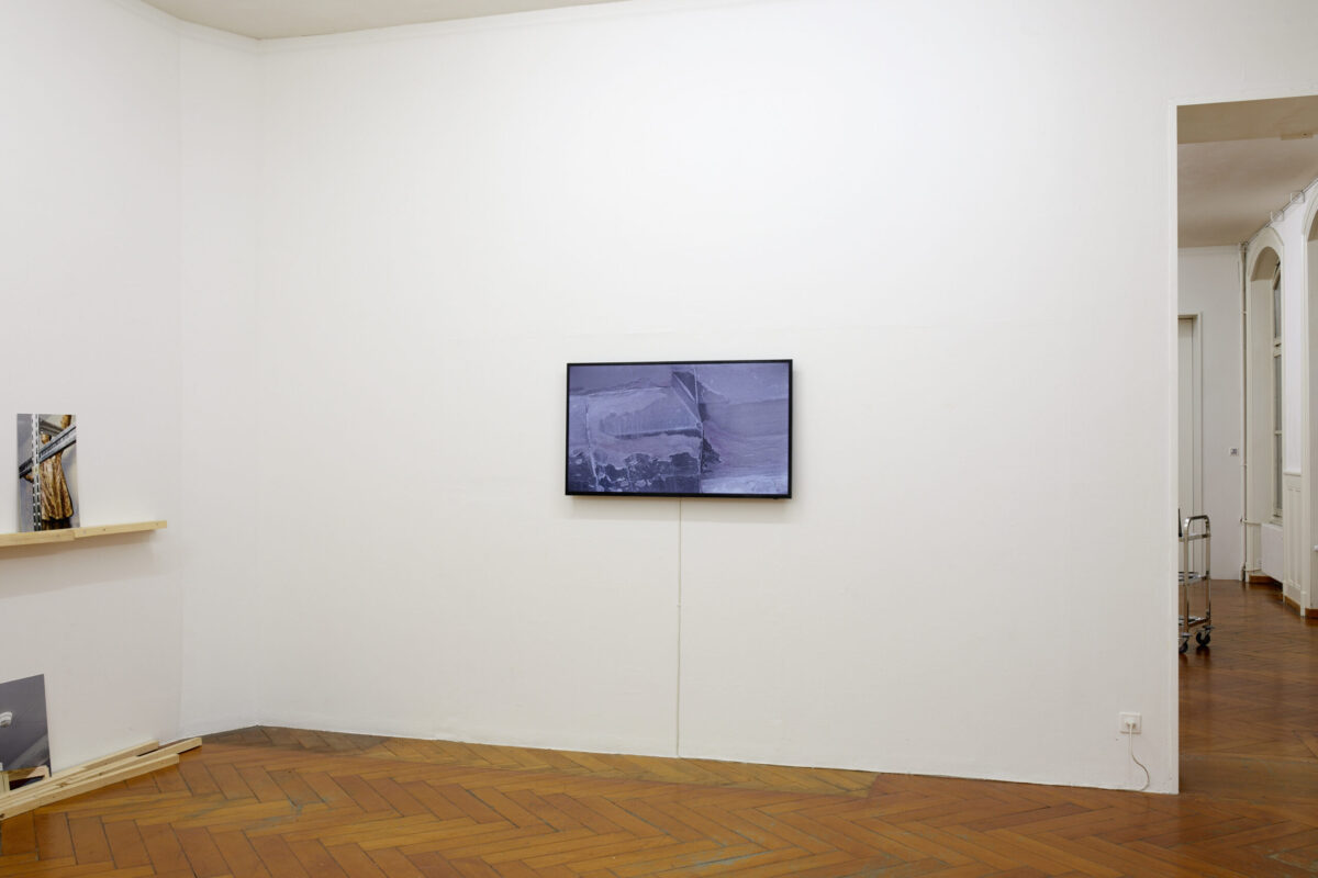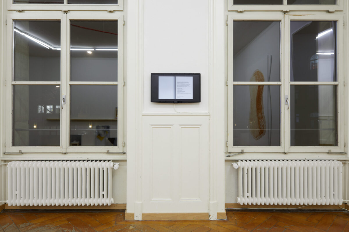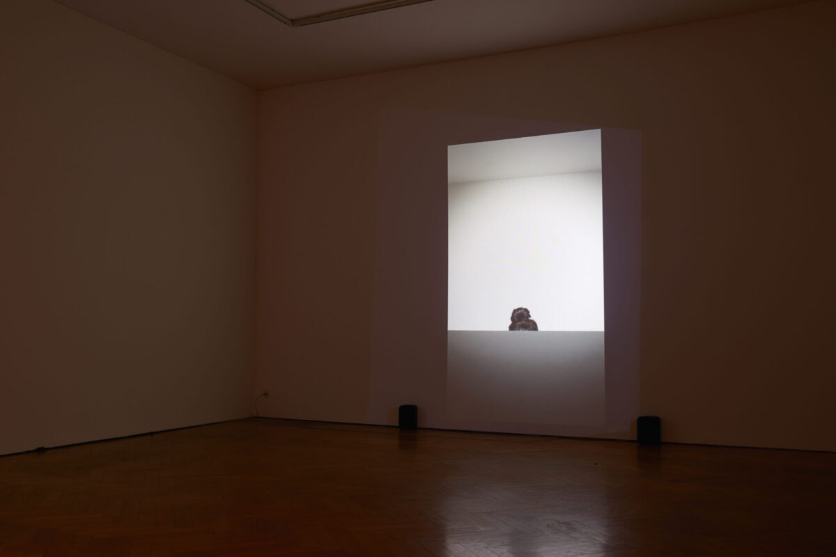 Auftritt über Alles (2016) von NINA LÍŠKA RIEBEN (*1992 in Bern, lebt und arbeitet in Bern) zeigt die ungeschnittene Videoaufnahme eines Versuchs, das gleichnamige Gedicht als Sprechakt in einem behelfsmässigen, bühnenartigen Setting zu inszenieren, inklusive Anweisungen durch einen Regisseur aus dem Off. Fehlversuche, Neuanfänge aber auch Wiederholungen einzelner Strophen bestimmen dabei die Struktur. Die Dialoge zwischen der Sprecherin und dem Regisseur in Umgangssprache stehen im Gegensatz zur inszenierten Sprache beim Vortragen des Gedichtes. In der Gesamtheit entsteht ein Akt zwischen Intention und Zufälligkeit.