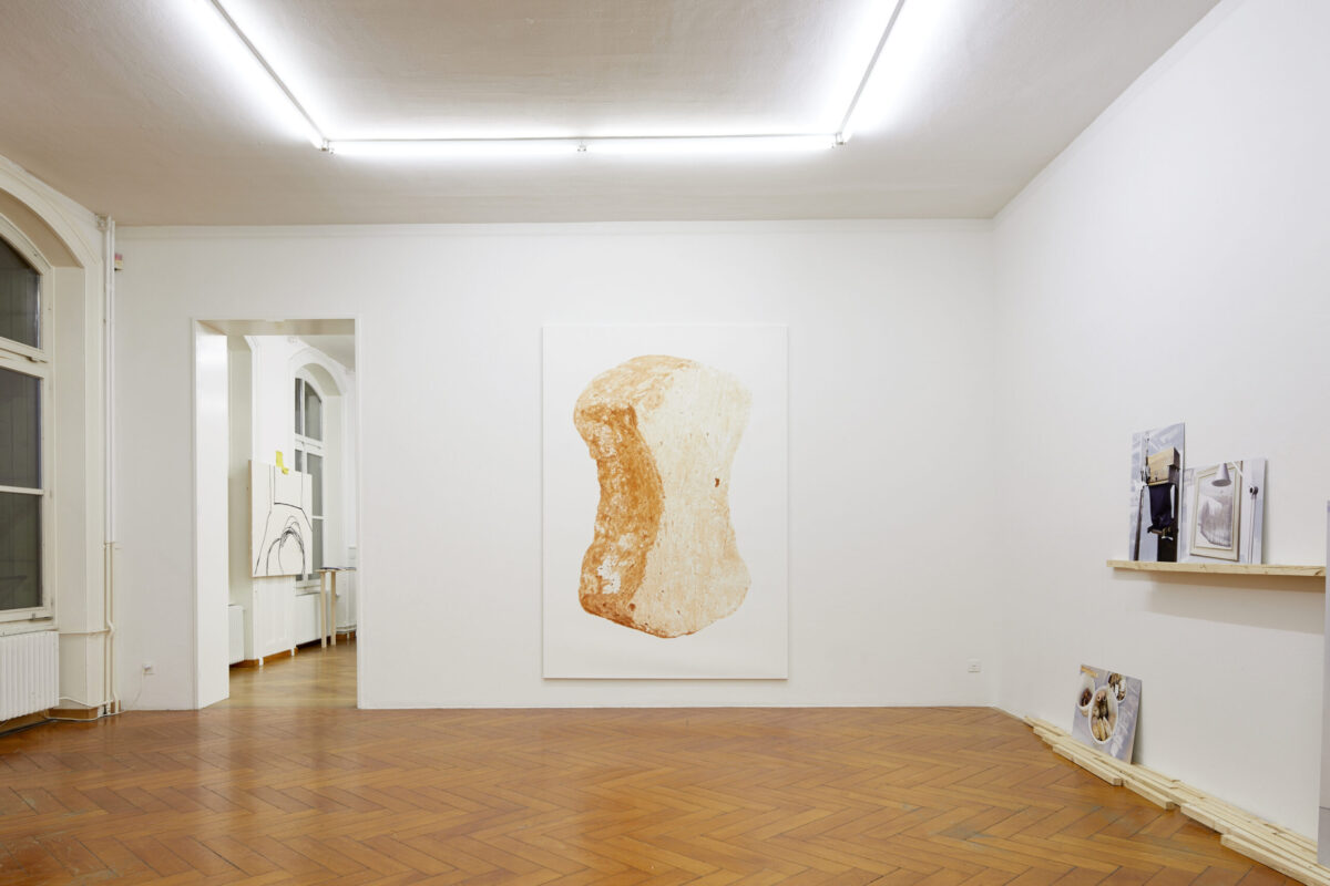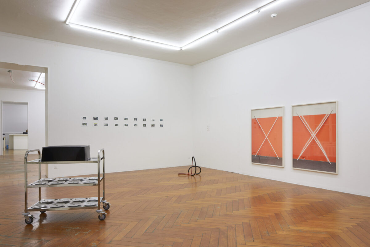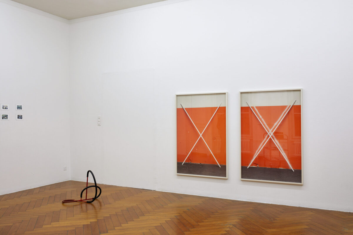 I wanna make it last forever (2016) von REBECCA (*1986 in Bern, lebt und arbeitet in Bern) ist ein Diptychon aus zwei Fotografien. Beide zeigen den gleichen Ausschnitt im Atelier der Künstlerin. Auf dem linken Bild lehnt ein Kreuz aus zwei weissen Stäben vor einer orange gestrichenen Wand. Das rechte Bild zeigt dieselbe Anordnung, wobei zusätzlich die Position des Kreuzes mit weissem Spray auf der Wand markiert wurde. Rebecca hält mit ihrer Arbeit mehrmals fest, was verschwinden wird: Einerseits wird das weisse Kreuz aus Stäben mittels Farbe konserviert, andererseits dokumentiert die Fotografie diese Markierung, weil auch die Wand selbst nicht bleiben wird – 2017 wird das Gebäude, in dem sich das Atelier befindet, abgerissen.