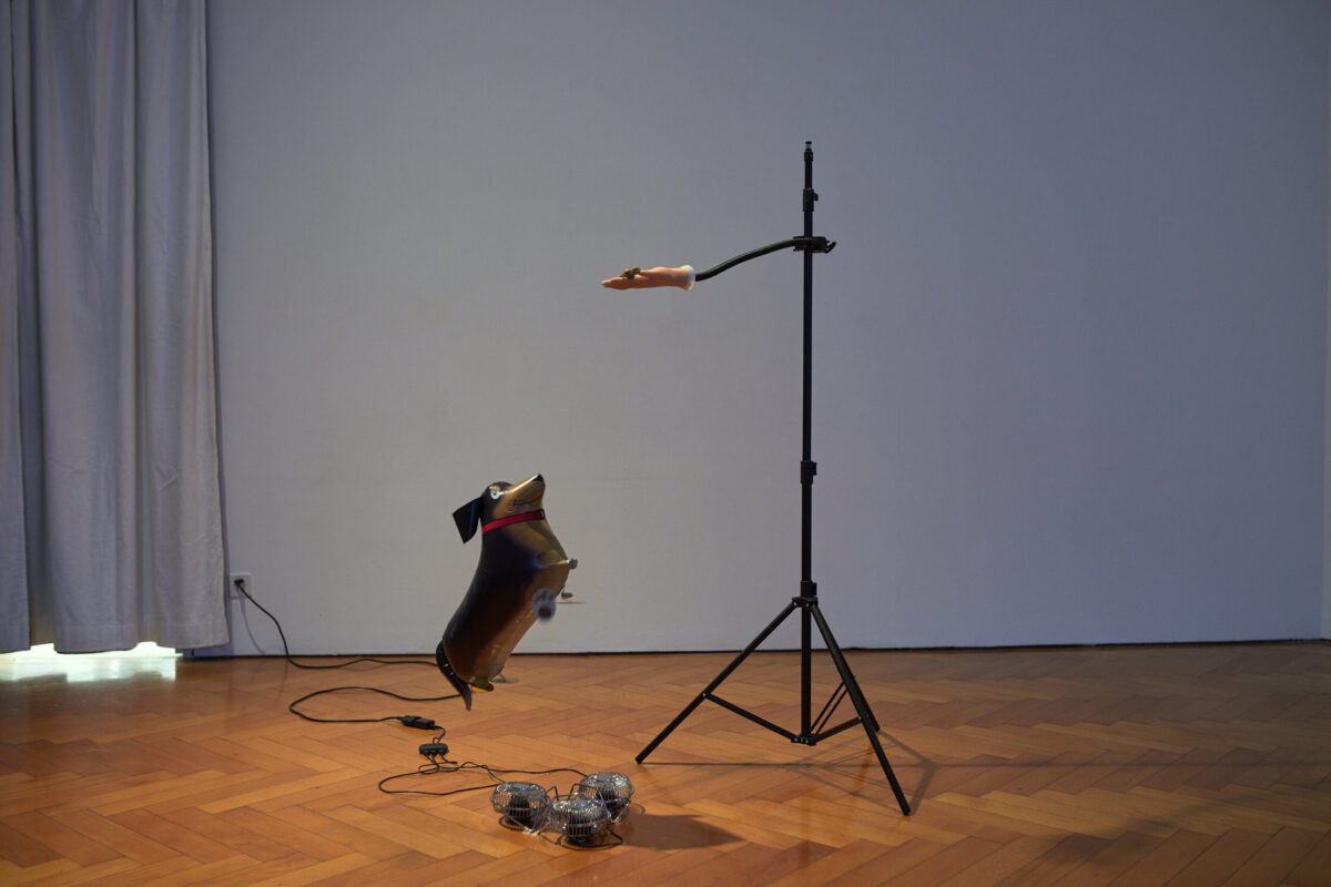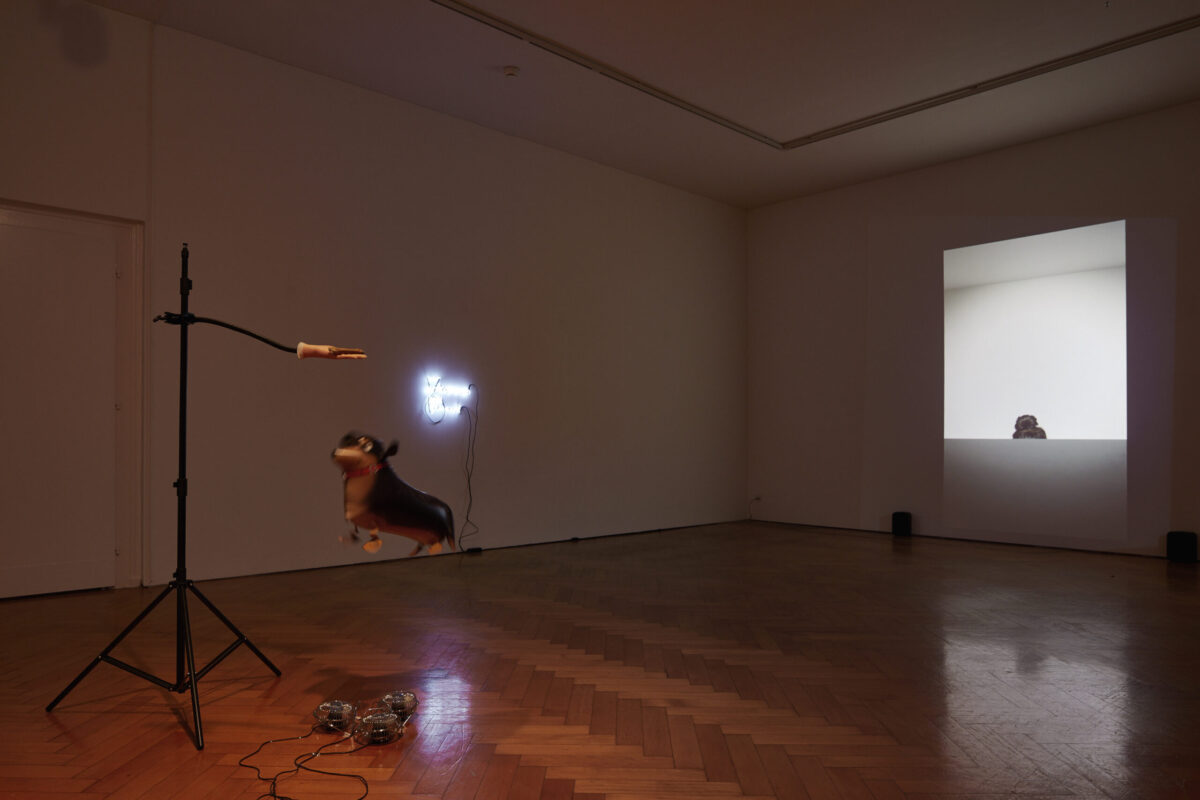Ähnlich der Strafe, die Sisyphus ereilt hatte, geht es dem Hund in der Arbeit Overworked Dog (2016), wobei nicht klar ist, ob er etwas und allenfalls was er denn verbrochen hat, dass PAUSE OHNE ENDE (Matthias Hachen *1982 in Riggisberg / Mischa Hedinger *1984 in Jegenstorf, leben und arbeiten in Bern und Zürich) es so eingerichtet haben, dass er nicht an den Knochen kommt. Gefangen in einem sinnlosen, sich endlos wiederholenden Verhaltensmuster und ohne Aussicht auf Erfolg, erinnert er nicht ohne Humor an den gesellschaftlichen Stereotypen des 24/7– Menschen, der vor lauter Ambitionen den Sinn und das Ziel der Tätigkeit verliert.