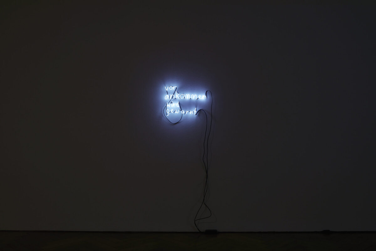 vor ankommen wird gewarnt (2015) – Die Arbeit von SUSANNE MULLER (*1953 in Baden, lebt und arbeitet in Prêles und Berlin) leuchtet einem als blaue Neonschrift entgegen. Die Warnung vor dem Ankommen betont den Weg als Ziel, sei es der persönliche, der einer künstlerischen Produktion oder auch der Weg durch eine Ausstellung, bei der man weniger ein gewisses Ziel im Auge hat, als dass die Ausstellung einem neue Wege und Ansichten eröffnet. Trotz dieser Warnung vor dem Ankommen manifestiert sich die Arbeit wie eine Aufforderung in einer definitiv wirkenden und klaren Form.