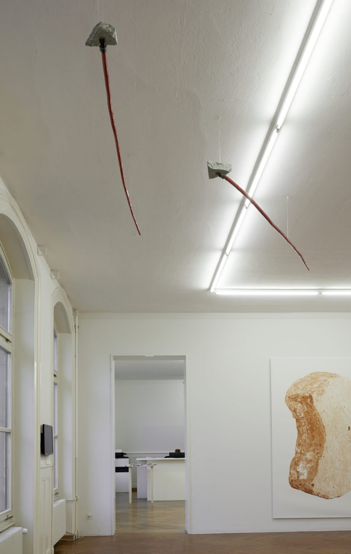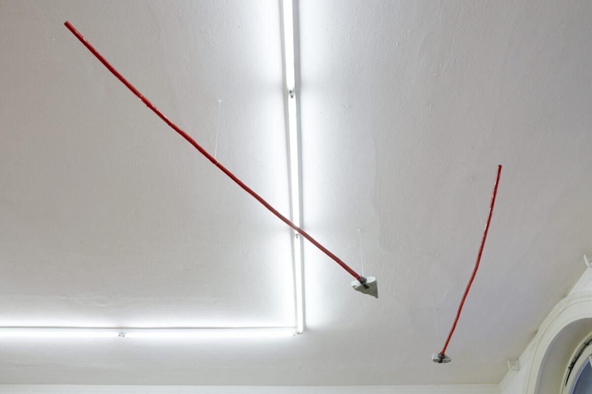 Die Arbeit Suspended Sign (2013 — 2016) von LIVIO CASANOVA (*1989 in Siat, lebt in Bern und arbeitet in Worblaufen) besteht aus mehreren an Speere erinnernde Objekte, die horizontal von der Decke hängen. Die archaische Steinspitze steht dabei in einem starken Kontrast zum filigranen roten Schaft des Speers, der die angedeutete Wurf-Funktion des Objekts infrage stellt. Als Pfeile gelesen zeigen die Objekte in unterschiedliche Richtungen, die sich so gegenseitig aufheben. Die Pfeile scheinen daher nicht Bewegung anzudeuten, sondern den Moment des Stillstands zu markieren.