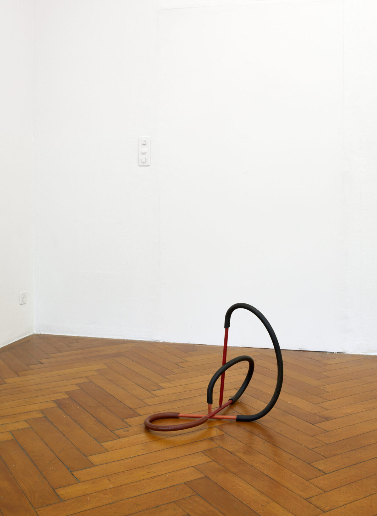 Die Skulptur Abfassung (2016) von BEAT FELLER (*1955 in Bern, lebt und arbeitet in Bern) ist scheinbar in sich geschlossen. Bestehend aus Metallstangen und Gummischläuchen, sind alle möglichen Anfangs- und Endpunkte der Skulptur ineinandergeschoben. Die Arbeit erinnert daher an eine Endlosschleife, wobei die Skulptur durch ihre verschiedenen möglichen Abläufe komplex und unschlüssig scheint.