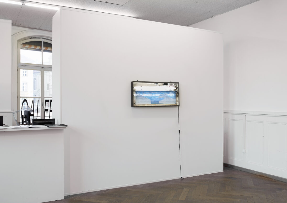 Das Innenleben des Kastens ist offengelegt: Verkabelung, Neonröhren, Abdeckmaterialien und rudimentäre Motoren sind sichtbar. Es bleibt ungewiss, ob es sich hier um ein Objet Trouvé oder eine Konstruktion des Künstlers JANOSCH PERLER (*1991 in Wünnewil, lebt und arbeitet in Bern) handelt. Durch den MoiréEffekt der sich langsam bewegenden Folie entsteht eine Wellenbewegung, die von mechanischem Meeresrauschen und dem flackernden Neonlicht begleitet wird. Unknown Pleasure (2015) nennt der Künstler das Werk, das trotz seiner unübersehbaren Künstlichkeit einen Sog entwickelt, welcher uns unweigerlich an einen anderen, exotischen Ort entführt.