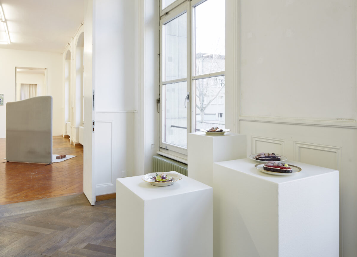 In Ankeböck und Schnitten (2011/12) spielt ANDREA EBERHARD (*1975 in Bern, lebt und arbeitet in Thun) mit dem Objektstatus: Wir sehen Sonnenanbeterinnen im Bikini auf mit Butter bestrichenen Brotscheiben liegen. Die Keramik-Objekte erinnern an Nippes aus dem Urlaub. Allerdings sind sie als klassische Skulpturenpräsentation auf einem Sockel gezeigt. Der Titel ist ein Wortspiel in Dialekt. Ein «Ankebock» ist im Berndeutschen ebenso ein Butterbrot wie die «Schnitte». Gleichzeitig wird «Schnitte» auch als Bezeichnung für eine attraktive Frau verwendet.
