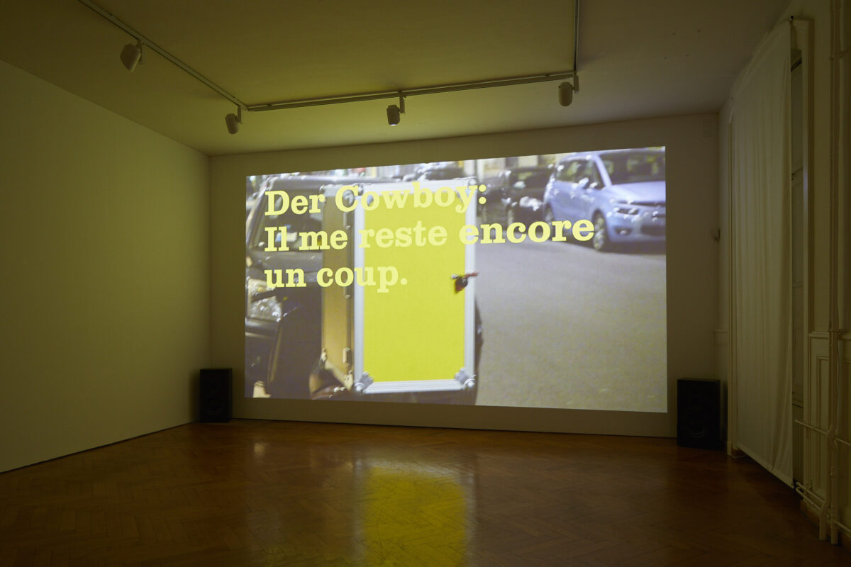 Im Video Fleur du pays, Pegman oder der zeitgenössische Cowboy (2015) von MAGALI DOUGOUD UND NICOLAS RAUFASTE (Magali Dougoud *1986 in Martigny, lebt und arbeitet in Lausanne, Nicolas Raufaste *1988 in Pompaples, lebt und arbeitet in Biel) ist Pegman, das gelbe Lotse-Männchen aus Google Street View, der Protagonist. Das Prinzip der virtuellen Entdeckungstour wird in eine filmische Erzählung übersetzt. Mit Pegman erkunden wir Landschaften und Stadträume und folgen einem Dialog, der sich in seinem Kopf abspielt. Die Bilder wie der dazwischengeschaltete Text setzen sich aus verschiedenen digitalen Quellen zusammen. Das Video thematisiert Auswirkungen uneingeschränkter räumlicher und zeitlicher Zugänglichkeit im digitalen Zeitalter.