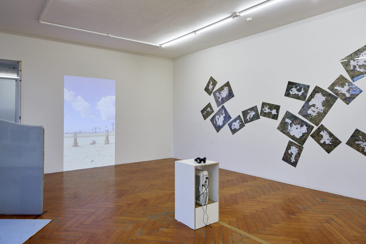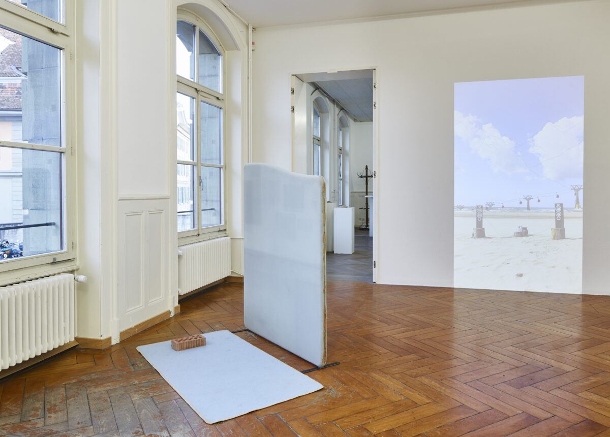 CÉLINE LIEBI (*1994 in Bern, lebt und arbeitet in Basel) setzt sich in ihrer Arbeit Schneeengel werden Sandengel (2015) mit den Geräuschkulissen natürlicher Umgebungen auseinander. Voraussetzung für das Werk war eine Soundperformance mit Gondelgeräuschen an einem Strand in Holland. Die Projektion zeigt eine Fotografie davon, in der Strandund Bergwelt verschmelzen und den Betrachter in eine Dunstwelt der Erinnerung versetzen. In der dazugehörigen Tonspur überlagert sich das Rauschen des Meeres mit dem Surren der Gondeln. Liebi analysiert, wie sich ein vertrautes Geräusch der heimischen Bergwelt gegenüber dem Fremden behauptet und sich durch eine ähnliche rhythmische Wiederholung dessen sogar annähert.