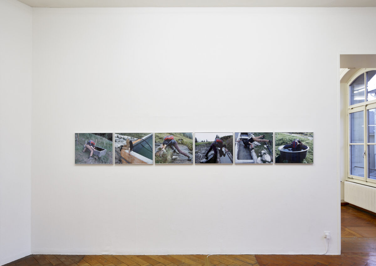 MARTIN MÖLL (*1972 in Bern, lebt und arbeitet in Bern) ist ein Sammler und der seit drei Jahren wichtigste Sammlungsgegenstand sind für ihn die Pilze. Während allen Jahreszeiten treibt es ihn zeit- und raumvergessen in die Wälder und Berge, an Flussufer und in Wiesenlandschaften. Dabei ist die Fotoserie Lauter Brunnen (2015) entstanden: Alle Bilder zeigen, wie der Künstler seinen Kopf in einen Viehbrunnen taucht. In Anlehnung an Erwin Wurms One minute sculptures spricht Möll von seinen Tauchaktionen als 1-minütige Performances. In den Fotos existiert eine geteilte Autorschaft, da Möll jeweils die ihn begleitenden Personen bittet, die Performance festzuhalten.