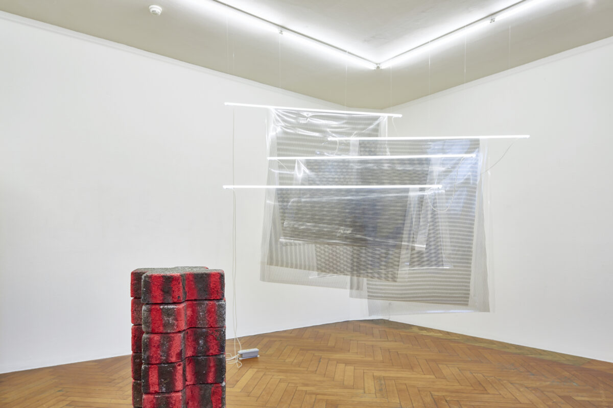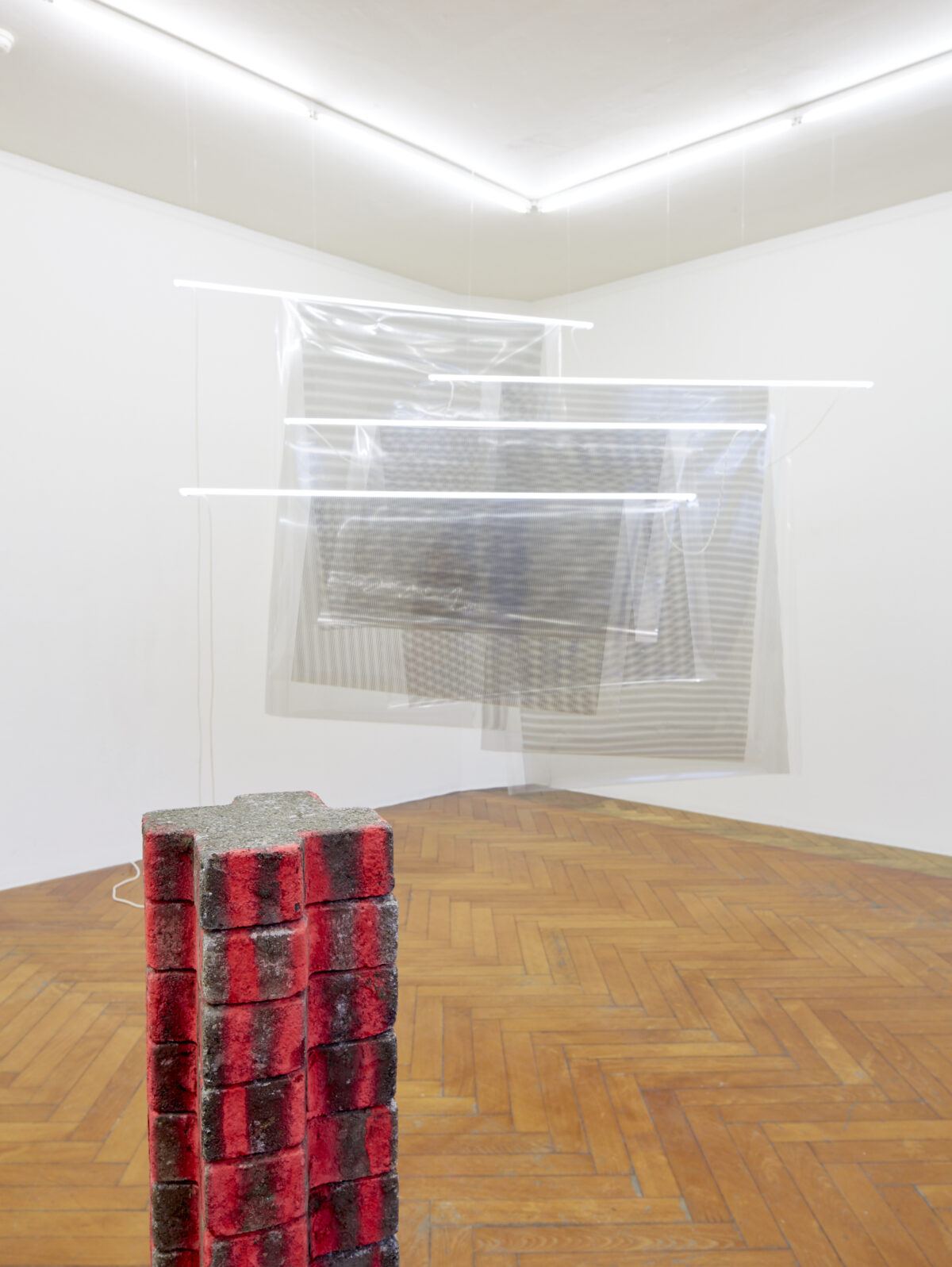 Vier Neonröhren dienen als Aufhängung für mit Linien bedruckte Transparentfolien. Durch die versetzte Anordnung der minimalen grafischen Struktur entsteht ein Moiré-Effekt. Unterstützt durch den Titel Niagara (2015) beginnen wir, in der leicht gewellten und reflektierenden Folie einen Wasserfall zu sehen. BARBEZAT-VILLETARD (Matthieu Barbezat *1981 in Nyon, Camille Villetard *1987 in Paris, leben in Bern und arbeiten in Bern und Sion) haben im Sommer 2015 eine Reise zu den Niagara-Fällen unternommen. Ihre Installation hält den Zwischenzustand von fallendem Wasser fest und ist ihre eigene Interpretation eines der beliebtesten Fotosujets von NordamerikaReisenden.