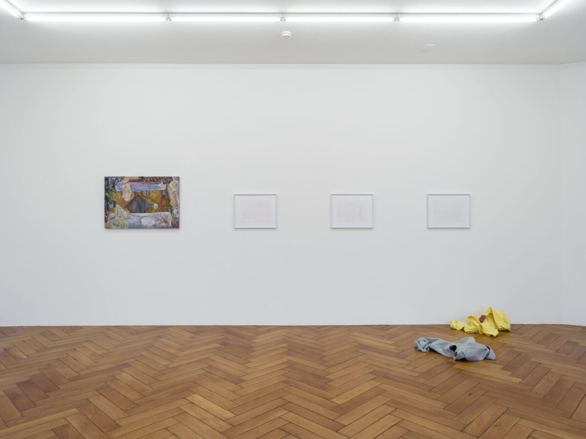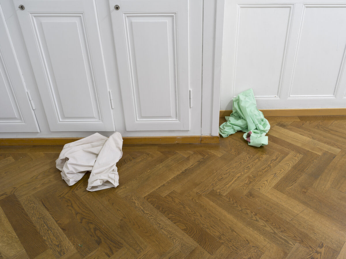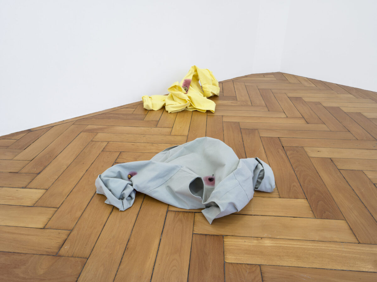 LAURA GRUBENMANNS Werk unter Fliegen (morgens) (2021) besteht aus einer Malerei, Objekten und einer Performance. Im Bild liegen zwei Figuren schlafend oder sich im Halbschlaf befindend auf einfachen Laken in einem leeren Raum, der nur noch durch eine Kolonie Fliegen bewohnt wird, die sich in einer Steckdose eingenistet haben. Die Ahnung von süsslicher Zersetzung in diesem Zusammenleben setzt sich in der textilen Arbeit und Performance blutsverwandt fort, welche an der Ausstellungseröffnung gezeigt wird. Performer*innen tragen Hemden, die mit Insekten und Pflanzensamen bestückt sind. Die Flecken auf dem Stoff erinnern an das Blut, das hier andere Organismen nährt. Es zeichnet sich der Schrecken des sich selbst bewussten Ichs ab, als Teil eines unentrinnbaren Systems mit fliessenden Grenzen und Abhängigkeiten.