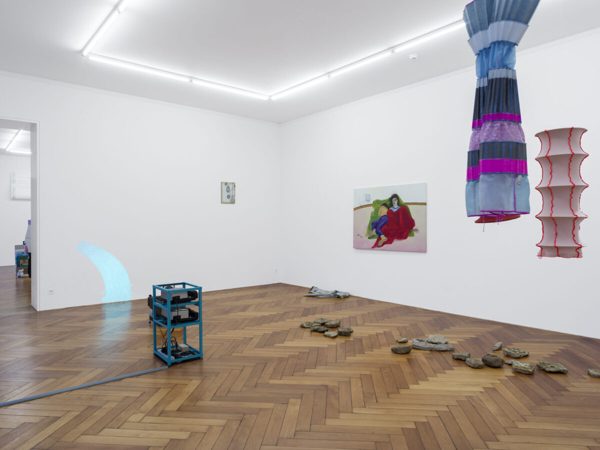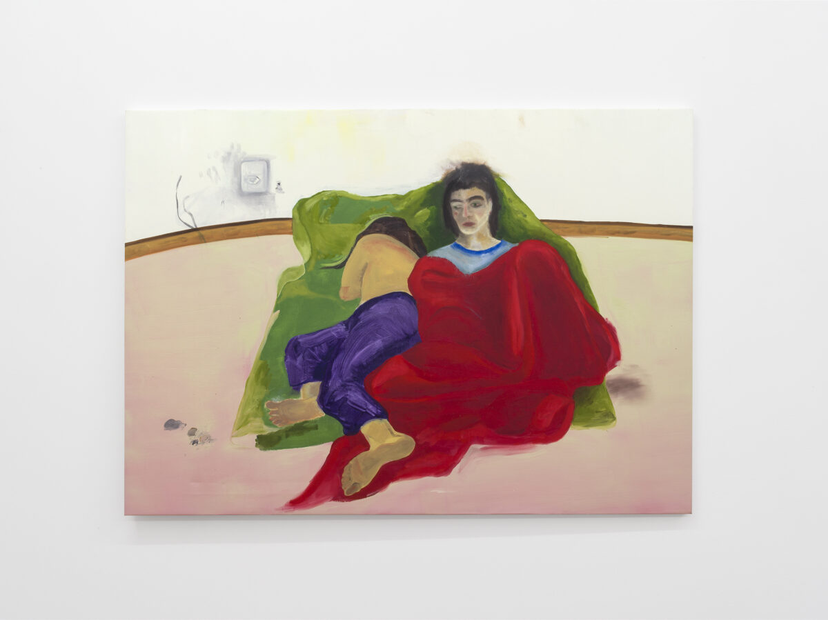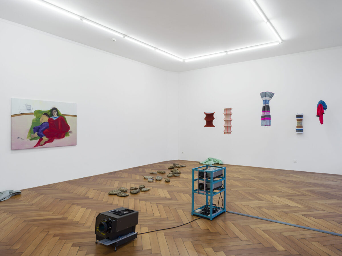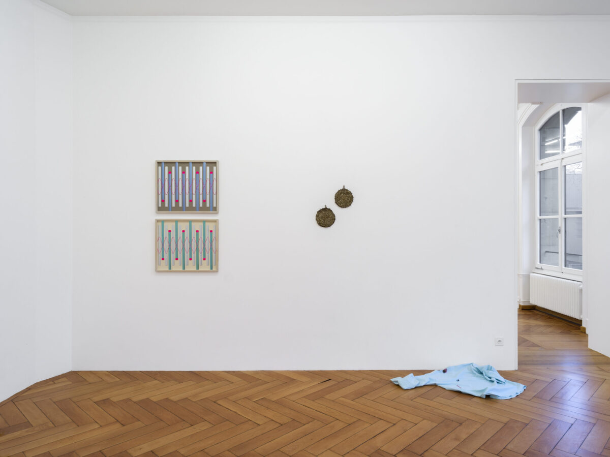 LAURA GRUBENMANNS Werk unter Fliegen (morgens) (2021) besteht aus einer Malerei, Objekten und einer Performance. Im Bild liegen zwei Figuren schlafend oder sich im Halbschlaf befindend auf einfachen Laken in einem leeren Raum, der nur noch durch eine Kolonie Fliegen bewohnt wird, die sich in einer Steckdose eingenistet haben. Die Ahnung von süsslicher Zersetzung in diesem Zusammenleben setzt sich in der textilen Arbeit und Performance blutsverwandt fort, welche an der Ausstellungseröffnung gezeigt wird. Performer*innen tragen Hemden, die mit Insekten und Pflanzensamen bestückt sind. Die Flecken auf dem Stoff erinnern an das Blut, das hier andere Organismen nährt. Es zeichnet sich der Schrecken des sich selbst bewussten Ichs ab, als Teil eines unentrinnbaren Systems mit fliessenden Grenzen und Abhängigkeiten.