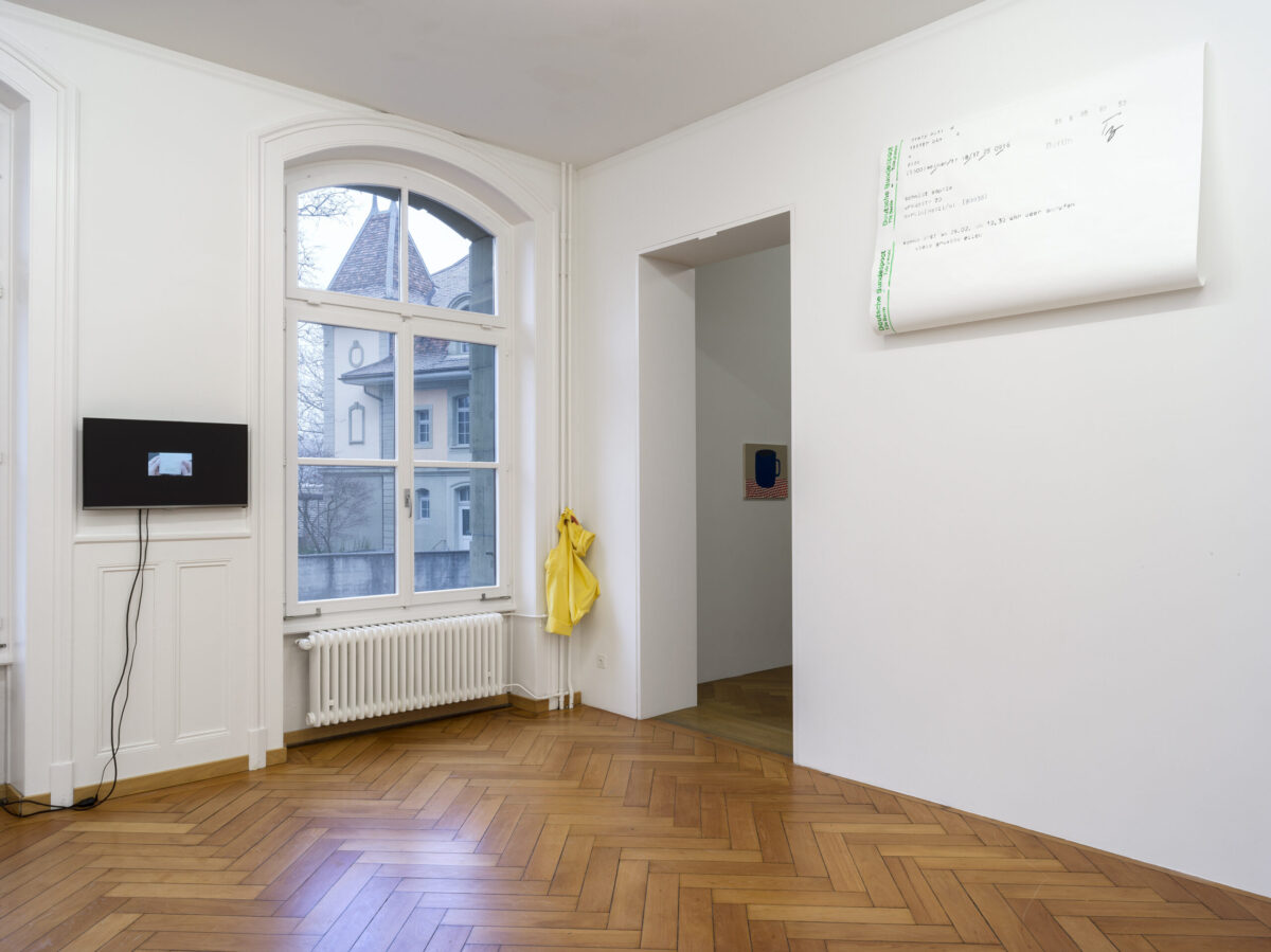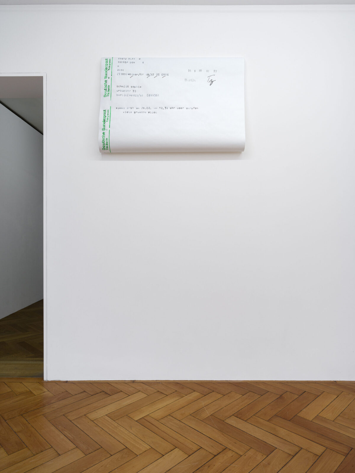Die Arbeit komme erst am 28.02. um 12,30 oder anrufen (2020) stammt von der Künstlerin SOPHIE SCHMIDT. In ihrer Praxis reproduziert sie von Hand gesammelte, alltägliche Dokumente wie Wartemarken, Kassenbons oder Telegramme in vergrössertem Massstab in Aquarell auf Papier. Entrückt von ihrem ursprünglichen Kontext, gewinnt sie ihnen eine neue Präsenz und Poesie ab. Die Telegramme stammen aus ihrer persönlichen Korrespondenz und verbinden Biografie und Weltgeschichte: Als die Künstlerin Ende der 1980er Jahren in Westberlin lebte, boten Telegramme die einzige Möglichkeit der kurzfristigen Kommunikation mit Freund*innen aus Ostberlin.