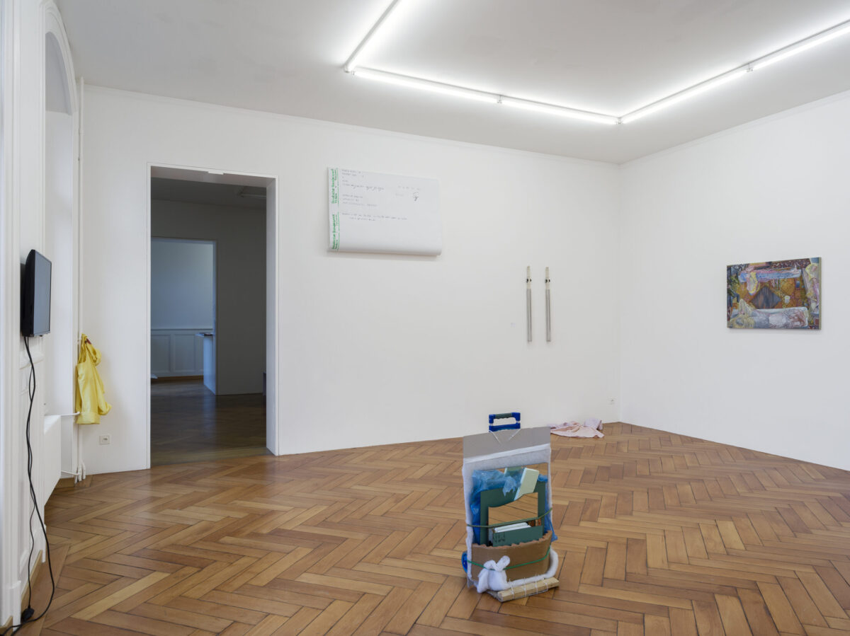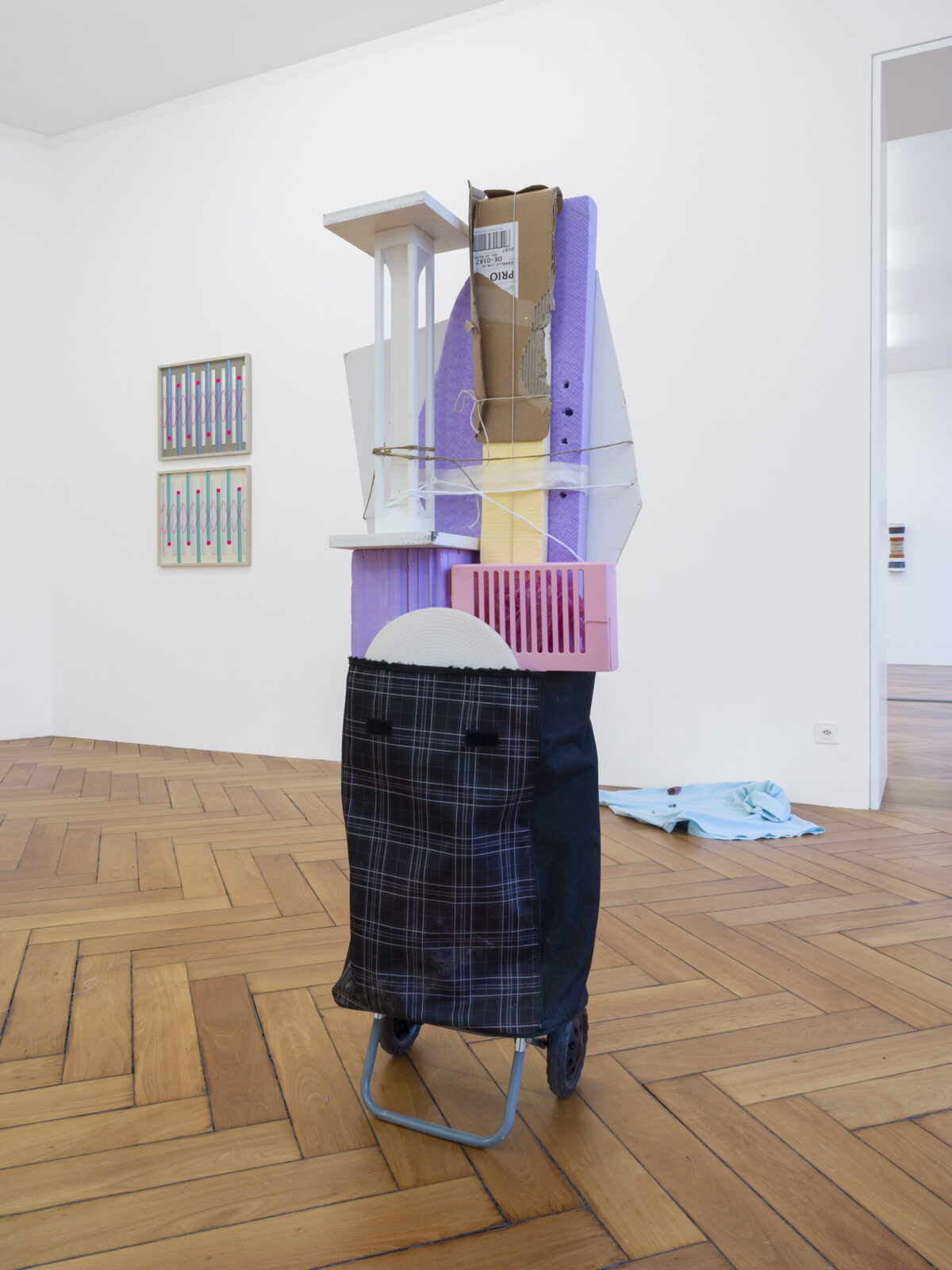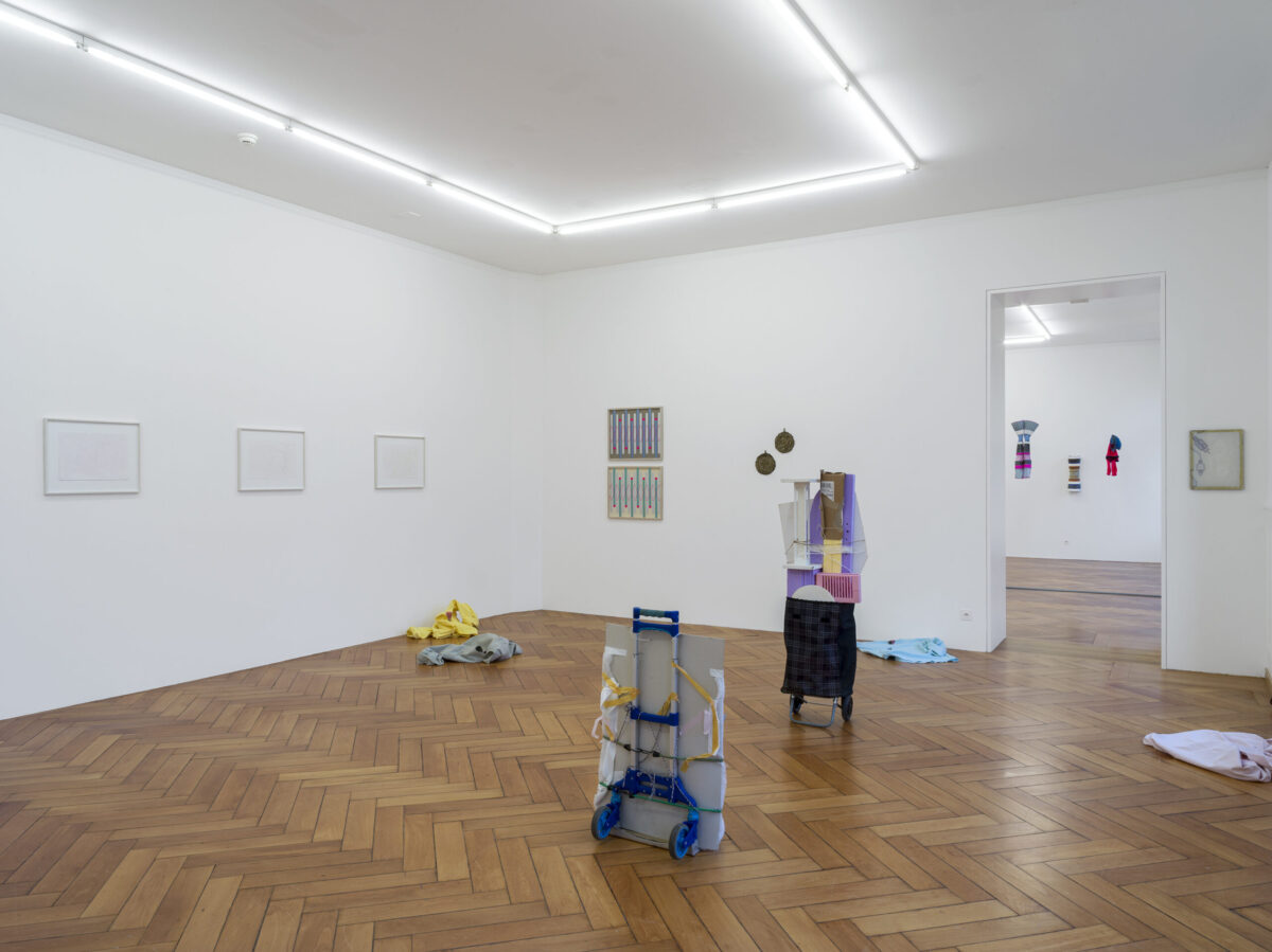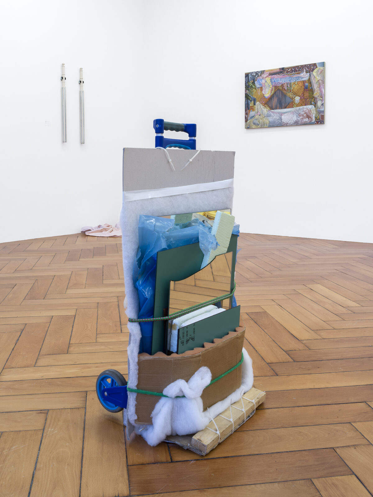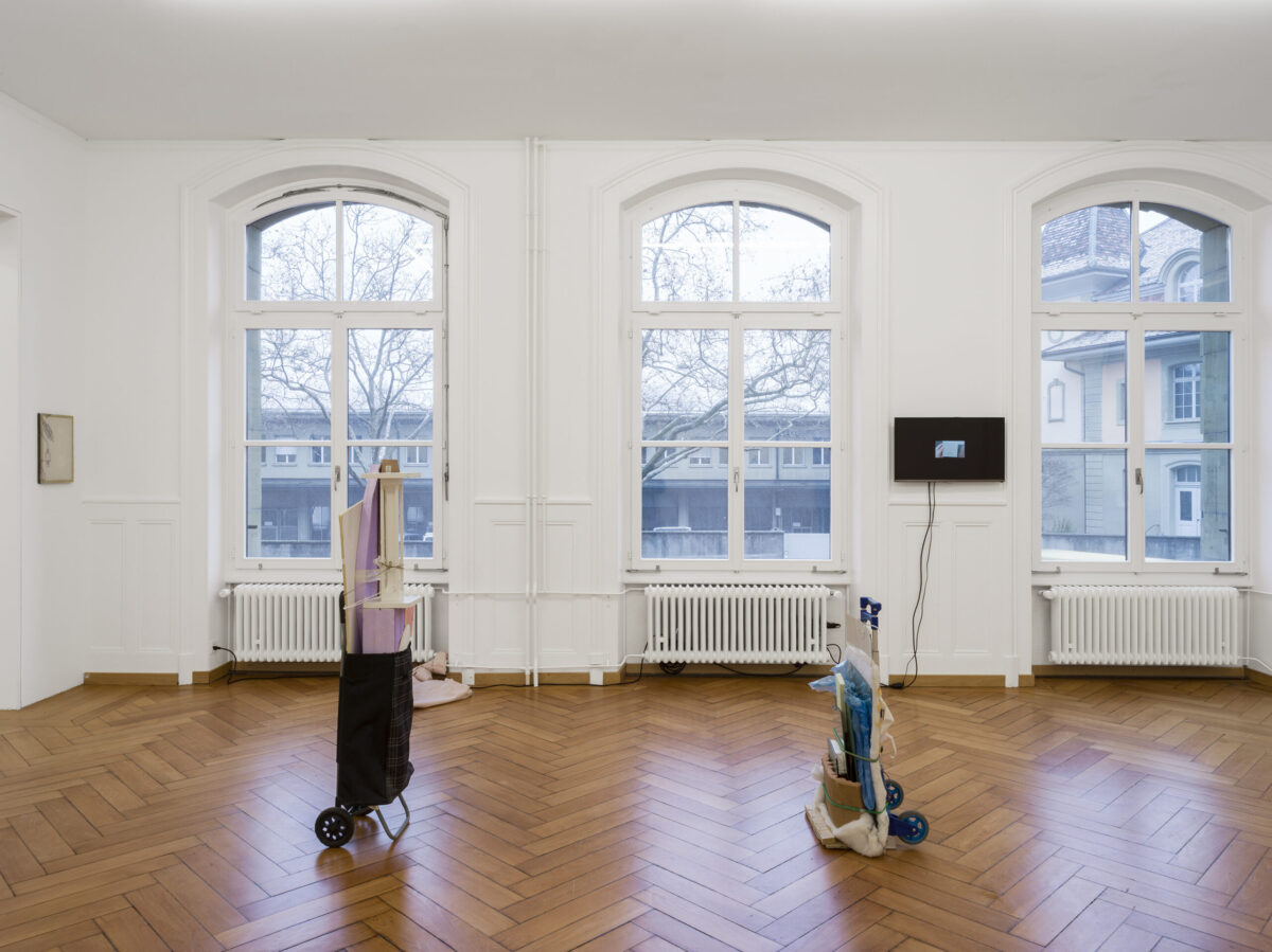 Die Installation von SAMUEL HAETTENSCHWEILER setzt sich aus zwei Transportkarren zusammen, die sich mit ihrem Transportgut, bestehend aus Fundstücken, zu Assemblagen formieren. Den Objekten Zwei Gefährte (2021) ist ihre Atelierproduktion anzusehen. Als einfache Transportvehikel verweisen sie in humorvoller Weise auf eine einfache, aber auch mühelose Form der Kunstdistribution. Die beiden Gefährten sind das Gegenteil von Effizienz. Ohne Versprechen nach Vollkommenheit bilden sie eine Hommage an das Unstete. Sie bleiben temporäre Besucher.