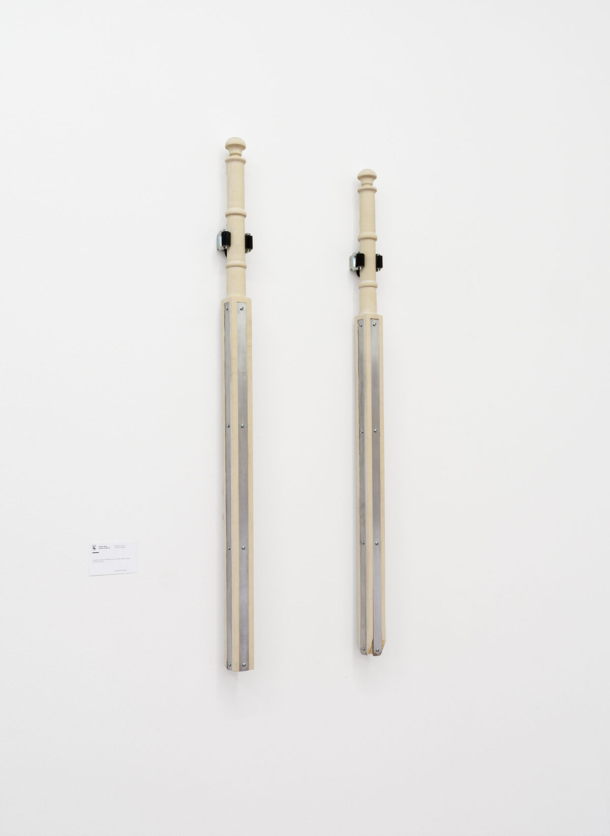 Die beiden Schläger der Arbeit Zwillinge (2020) bleiben so lange identisch, bis sie durch CHRISTOPH STUDER in einem performativen Eingriff unterschieden werden. Sie sind gleichförmig aus demselben Ahornholz, vom gleichen Baum, gedrechselt und verfügen über identische Aluminiumeinlagen. In der Performance, die am Tag der Ausstellungseröffnung stattfindet, wird einer der Schläger benutzt, der andere bleibt unbenutzt. Die Abwesenheit von Schlagspuren werden ebenso Informationsgehalt wie die Spuren selbst. Die Spuren der Energieeinwirkung des einen, wie auch die Unversehrtheit des anderen, versteht der Künstler nicht als wertende Differenz, sondern lediglich als eine Aufzeichnung aller performativen Gesten.