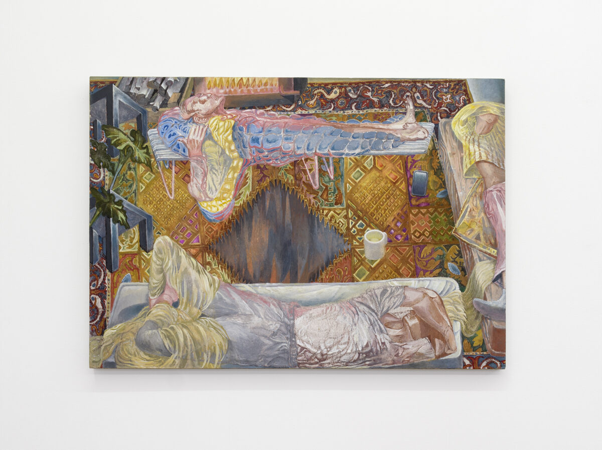 Wie bei einer ausserkörperlichen Erfahrung, schwebt der Blick der Betrachter*innen über drei Personen, die erstarrt in einem Zimmer auf Pritschen liegen. Im Cheminée lodert ein Feuer, Perspektiven verzerren sich, und der Blick verliert sich in den Tiefen des Teppichgewebes. Im Bild K-Hole (2020) von MATTHIAS WYSS verschränken sich die inneren und äusseren Realitäten dreier Personen die sich in privater, häuslicher Atmosphäre im Ketaminrausch befinden.