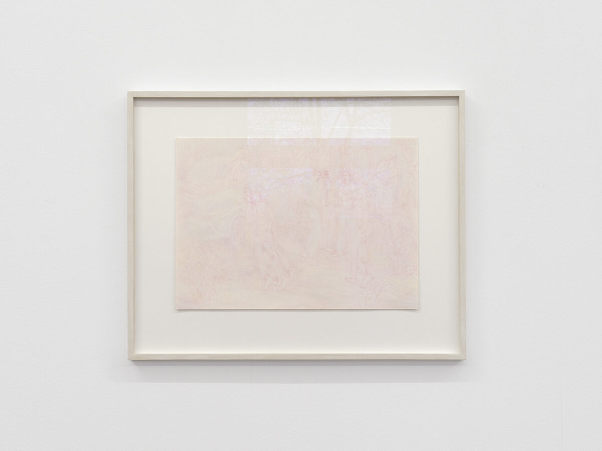 An die Farbstiftzeichnungen von NICOLAS GRAND muss sich das Auge erst gewöhnen, bis sich im hellen Muster der feinen Striche Figuren und Details abzeichnen. Seine Bilder sind an den Grenzen des Sichtbaren. Das Wahrnehmen wird in seinen Zeichnungen explizit zu einem Akt der Rekonstruktion und Projektion, als wenn sich die Betrachtenden an eine lang zurückliegende Szene oder an einen halb vergessenen Traum zu erinnern versuchten.