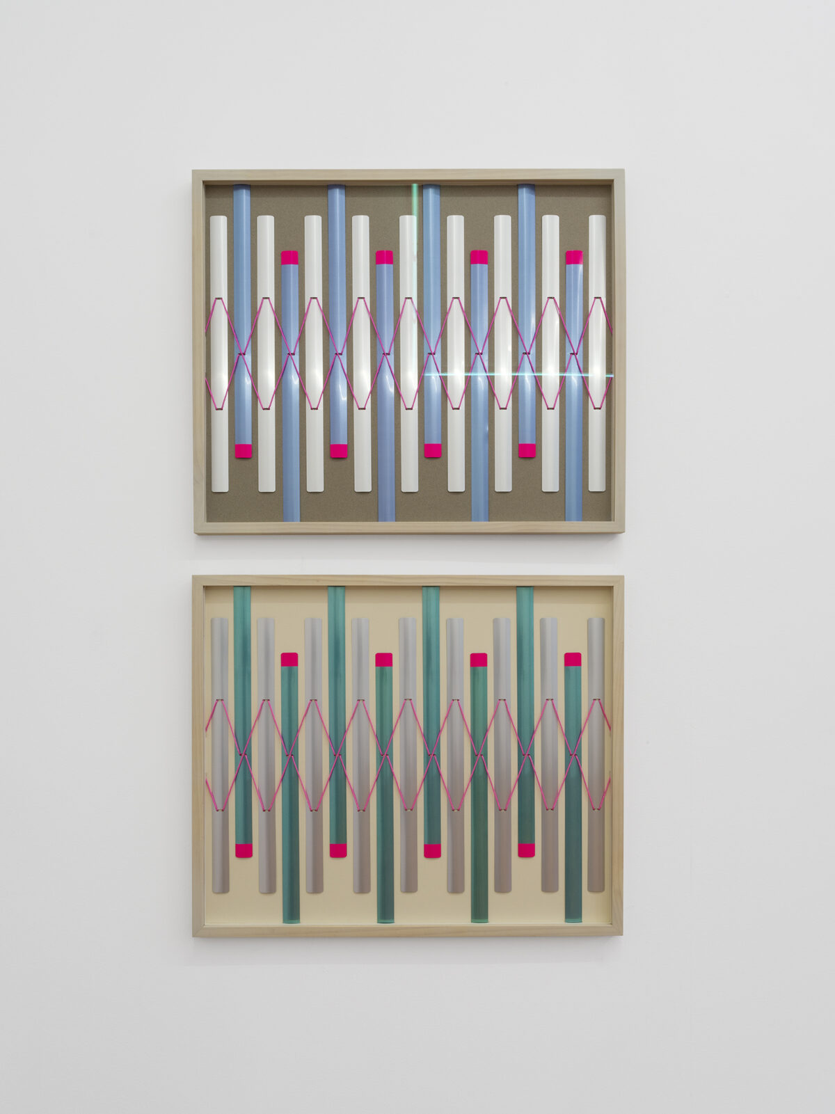 Die Arbeiten 21‘014 und 21‘015 (2021) hat LUKAS VERAGUTH aus wiederverwendeten Lamellen von Jalousien gefertigt. Der Künstler überführte im Werk die ursprünglich waagerechte Anordnung in eine senkrechte Rhythmisierung. Die metallenen Oberflächen der farbigen Lamellen reflektieren das einfallende Umgebungslicht. Die Schnur, welche vormals die Funktion der Jalousien gewährleistete, wird in pinker Farbe zu einem rhythmischen Muster, das dem Relief eine textile Qualität verleiht.