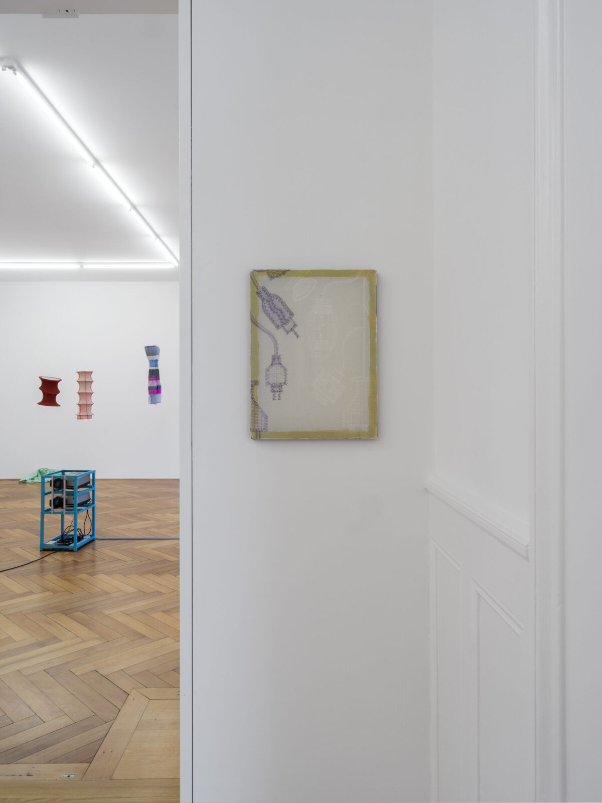 Als Teil ihrer intensiven, langjährigen Beschäftigung mit Stickerei entwirft STÉPHANIE BAECHLER in einem Abstand von zehn Jahren eine Ätzstickerei, welche die jeweiligen Kabelstandards der Gegenwart abbilden. Dem industriellen Stickvorgang liegt hierbei ein sogenannter PUNCH zugrunde, welcher die Stichfolge in abstrahierten Vektoren darstellt. Ebendieser Bauplan wurde für die gezeigten Stickereien auf das Sechsfache vergrössert und der Stoff danach auf Siebdruckrahmen aufgespannt. Die Verschränkung von Oberfläche und Information lässt Assoziationen mit integrierten Schaltungen aufkommen.