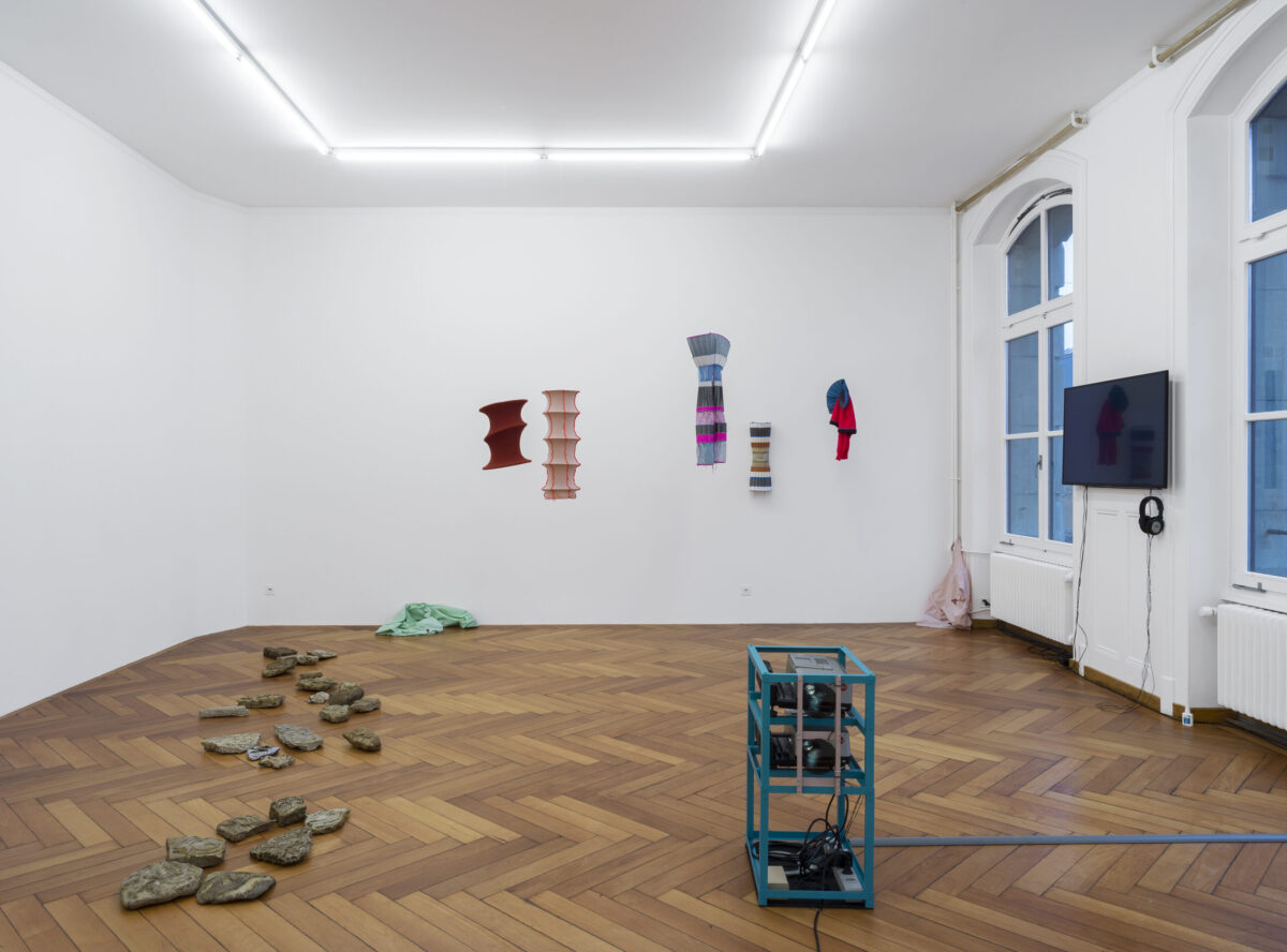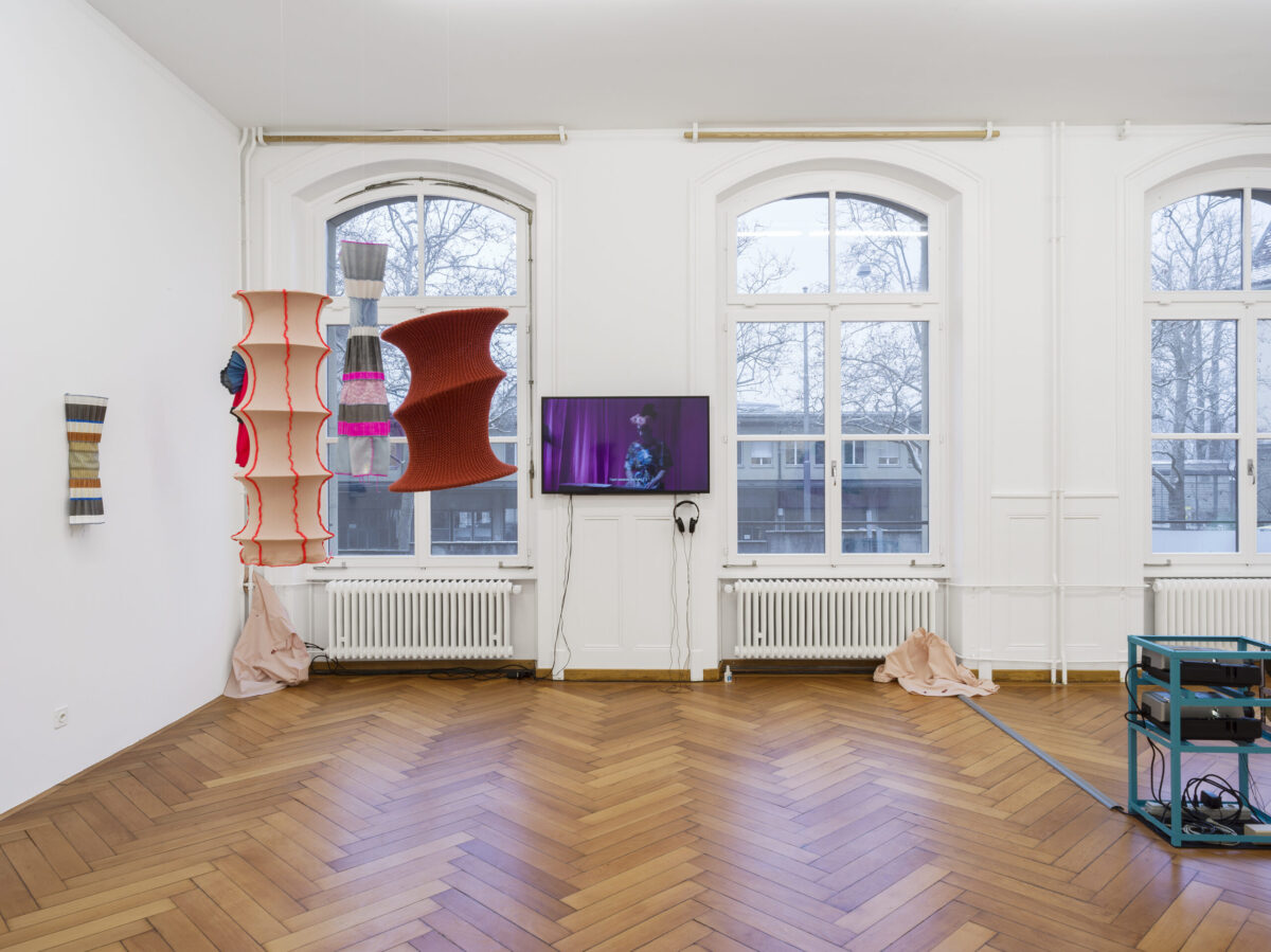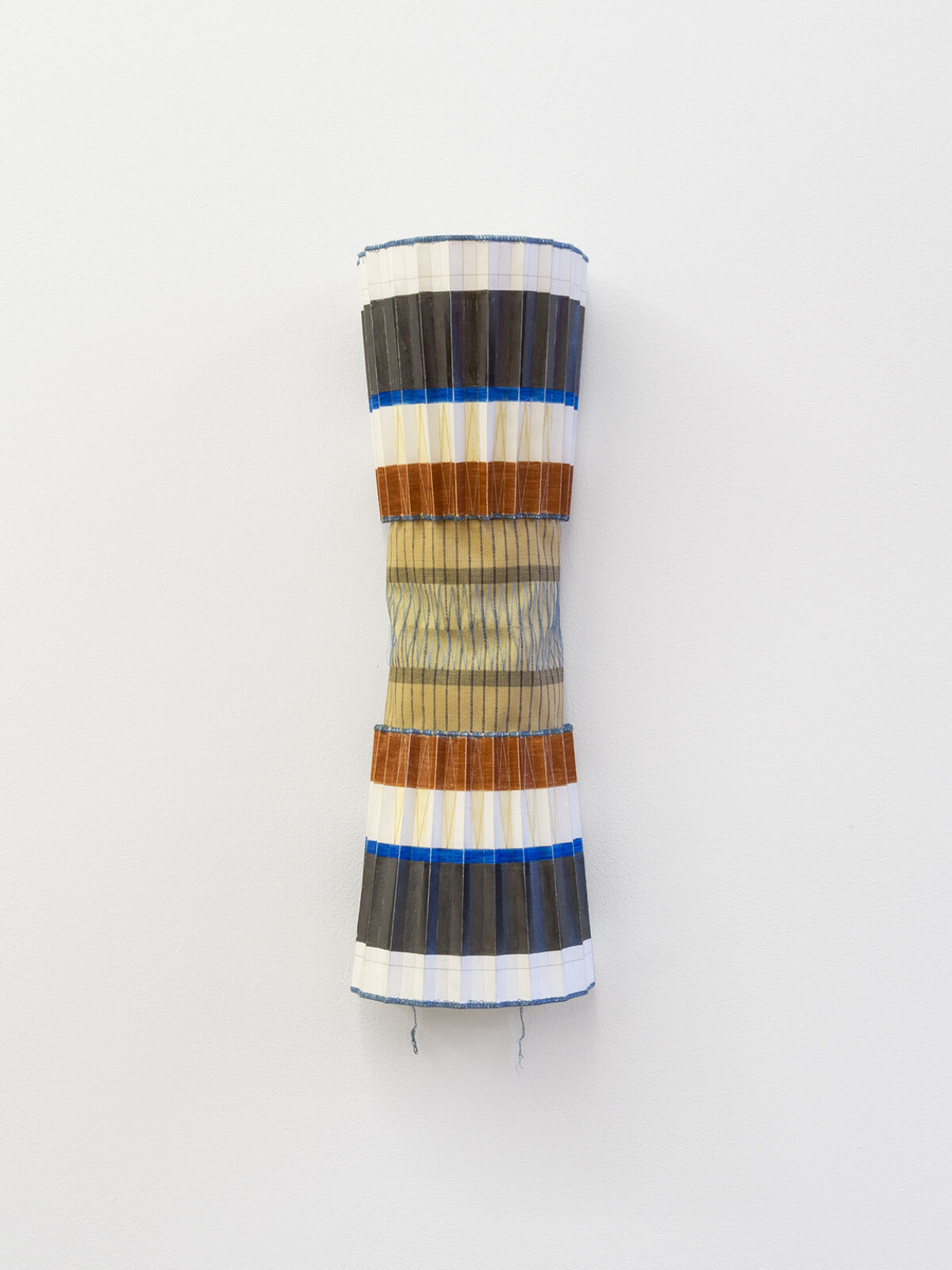 BARBARA FEUZ Objekte aus der Serie Ensemble (2016, 2021) wirken manchmal wie aufgehängte Kleider, die ein Tragen durch menschliche Körper andeuten. Ein andermal wie lampenschirmähnliche, geometrische Hüllen; Kostüme eines sich andeutenden Balletts der Formen und Körper. Gefertigt sind die Objekte aus Textilien und gefaltetem Zeichenpapier, bearbeitet mit Grafit- und Farbstiftzeichnungen. Die Faltungen erinnern an Halskrausen oder Hüfthalter, die jedoch keine Rückschlüsse auf das Geschlecht möglicher Tragenden zulässt.