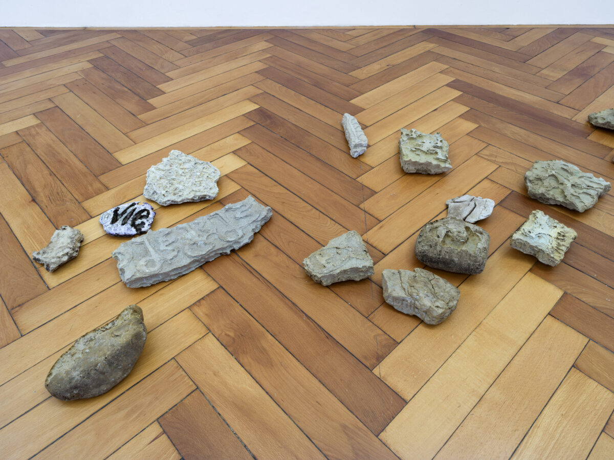 Karstlandschaften sind im Juragebirge oft anzutreffen. Die Erosion des Kalksteins prägt die Landschaft und macht gleichzeitig das Fortschreiten von Zeit erfahrbar. DARKO VULICS Steinarbeiten Libération de l’âme de la pierre (2020-2021) bedienen sich eines eigenen, beschleunigten Erosionsverfahrens: Das Juragestein wird mit Salzsäure behandelt, um neue Formen und Zeichnungen in die Oberfläche einzuschreiben. Die Zeichnungen von Darko Vulic erhalten in Stein geätzt eine tiefenzeitliche Qualität.