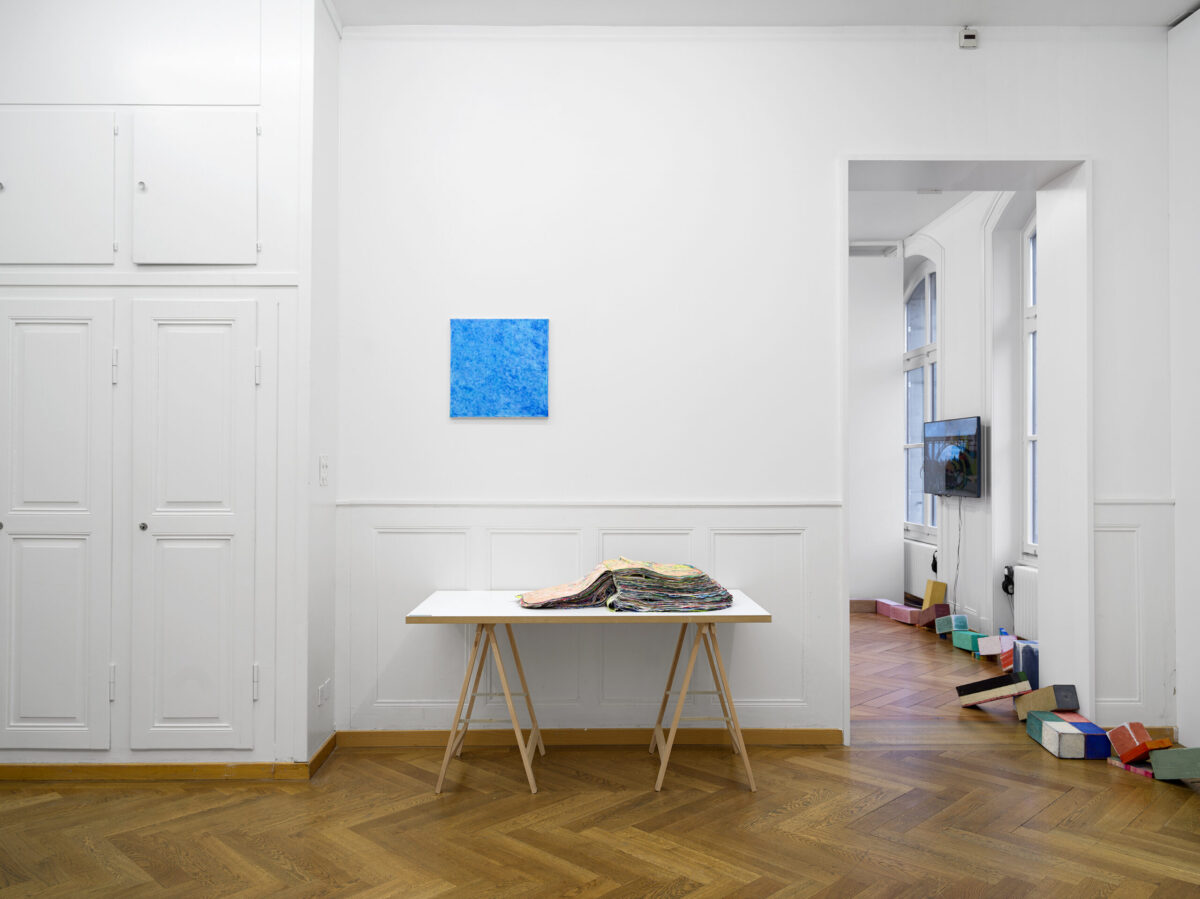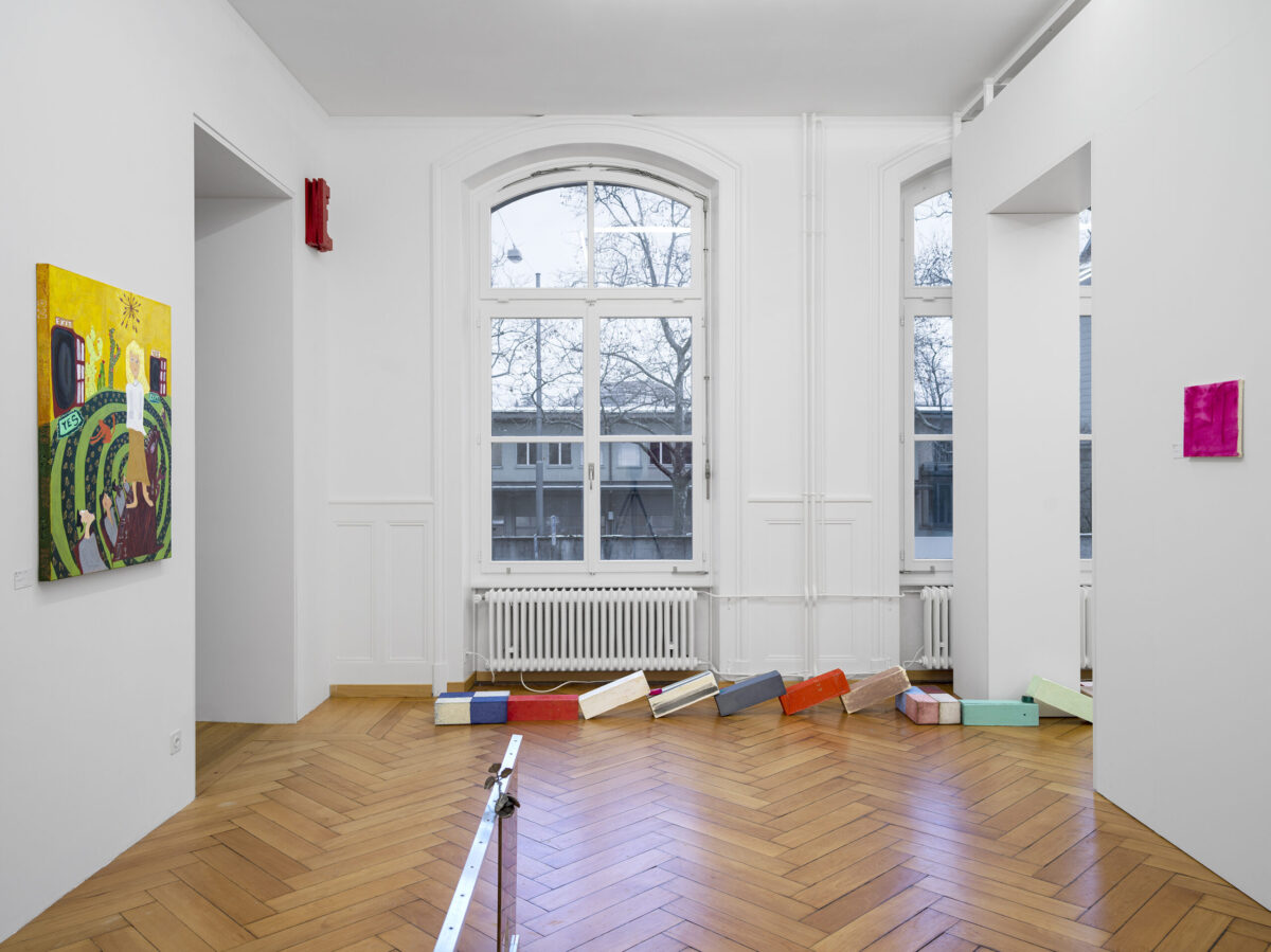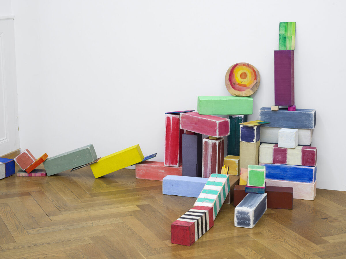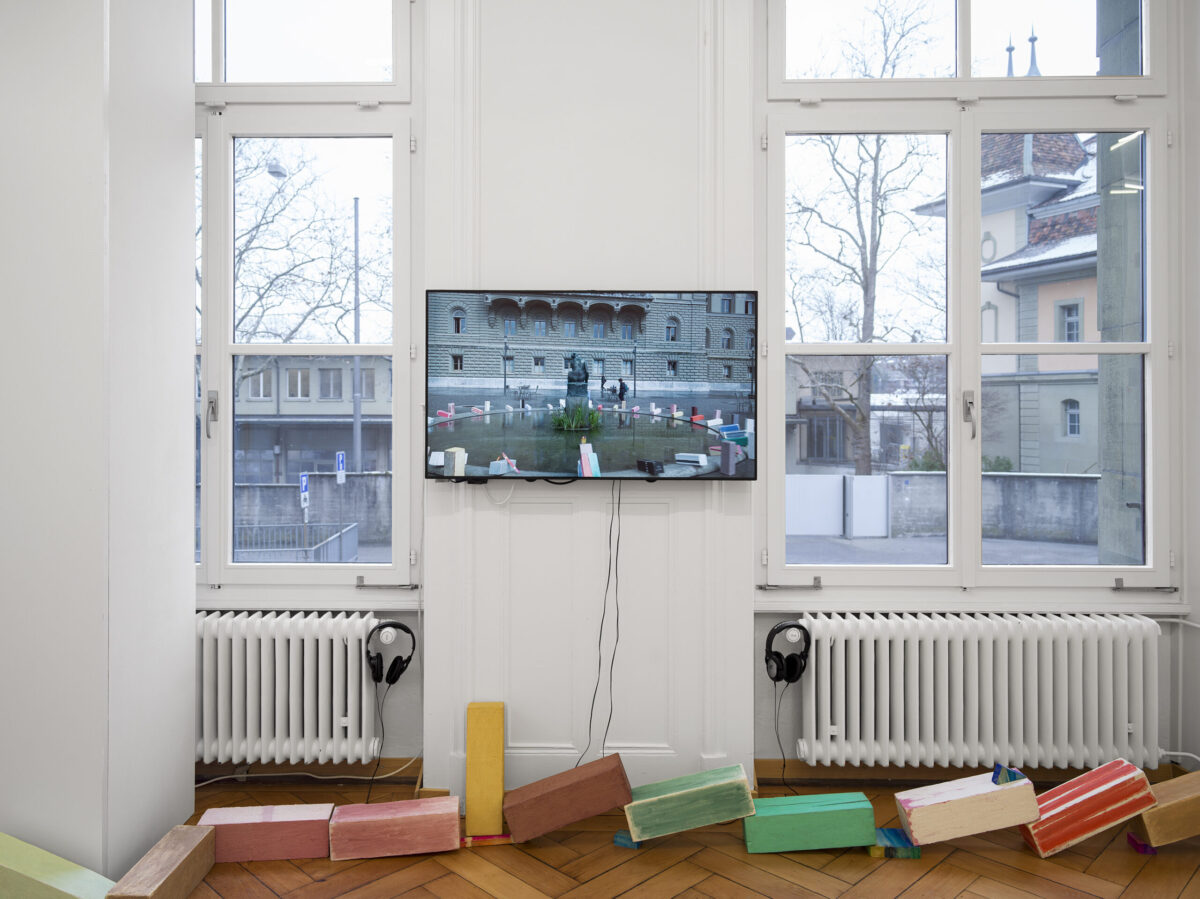 Für ihre Arbeit Heim / Werro (2021) eignet sich PIA HEIM die Tütschis des Berner Künstlers Roland Werro (1926–2018) an. Die Tütschis sind bemalte Holzquader, die Werro ab 1986 als Wandobjekte fertigte. Pia Heim realisierte mit den Quadern 2021 temporäre Anordnungen im öffentlichen Raum der Stadt Bern, die Fragen nach Autor:innenschaft und dem Umgang mit Nachlässen aufwerfen und an Wertkriterien rütteln. In der Stadtgalerie zeigt sie eine Neuanordnung der Quader und die Dokumentation ihrer temporär realisierten «Versammlungsorte».