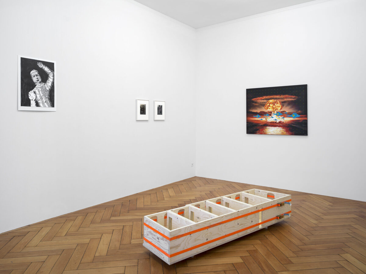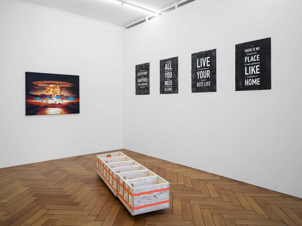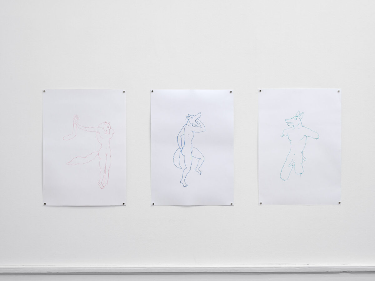 Die Serie Fragmente (2022) von CHRISTOPH STUDER zeigt Männerkörper in unterschiedlichen Posen mit Hundeköpfen, die an die Masken der Pupplay Community erinnern. Die teils fragmentierten Körper werden zum Ausdruck unterschiedlicher mentaler Zustände wie Angst, Kontrollverlust, Dissoziation oder Zwang. Lebe dein bestes Leben. Bleib positiv. Alles, was du brauchst, ist Liebe. Motivationssprüche haben einen seltsamen Imperativ. Wer spricht hier zu wem? In ihnen vermählt sich die Selbstverwirklichung der Hippies mit der Selbstverantwortung der Neoliberalen. Die Holzschnitt-Plakate von CELINE AERNOUDT (*1995, lebt und arbeitet in Brüssel) & EMILE VAN HELLEPUTTE (*1992, lebt und arbeitet in Brüssel) ergänzen diese Imperative der Selbstoptimierung zu Sätzen der politischen Agitation. Mit ihrem Modell der Stadtgalerie im Massstab 1:10, das eine überlegene Perspektive suggeriert, wirft ihre Arbeit Fragen zu Machtverhältnissen und politischer Selbstbestimmung auf.