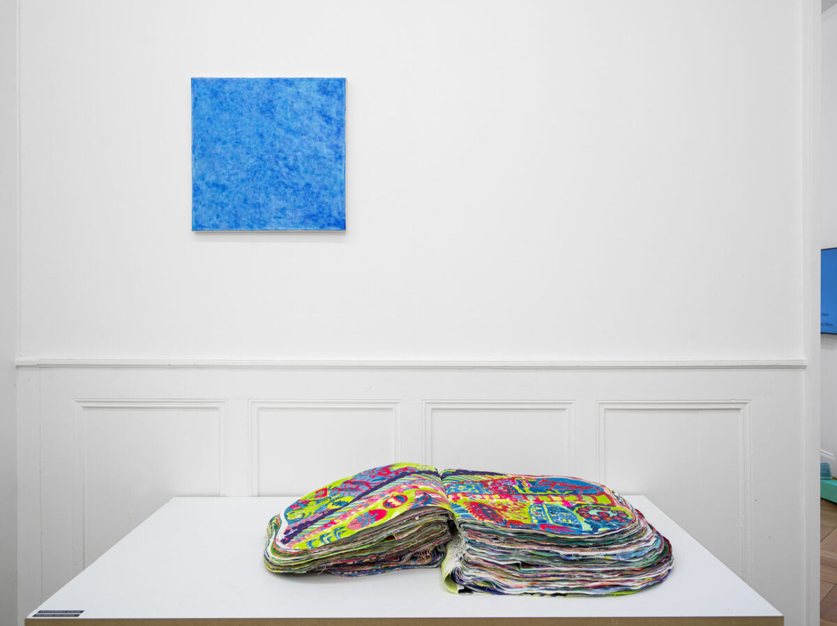 Das Objet-livre stratographie (2019–) von DARKO VULIC (*1960, lebt und arbeitet Boncourt) ist ein Tagebuch aus Bettlaken. Das Buch ist für den Künstler ein Ort der malerischen Aufzeichnung spontaner Gedanken. Wie Sedimentschichten fügen sich die Blätter mit seinen Aufzeichnungen zu einem hügelartigen Buchobjekt zusammen: Seine persönliche Zeit und die überpersönlichen Zeichen denen er sich bedient, schreiben sich Schicht für Schicht ein. 2016 war der Künstler gezwungen, lange Zeit im Bett zu verbringen: «Nach und nach begannen die Bettlaken, in die ich eingewickelt war, in meine Gedanken und Träume einzudringen.»