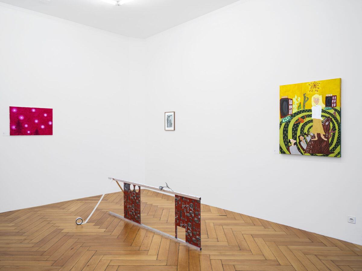 SAPIR KESEM LEARYs (*1988, lebt und arbeitet in Bern) Malereien zeigen persönliche, alltägliche Situationen. Musterungen, Spiralen und gekippte Fluchten entfalten eine Sogwirkung: Der Raum wird zur erweiterten Architektur zwischenmenschlicher Beziehungen, Exzess, Einsamkeit oder Trauma. «Ich ziehe es vor, meine eigenen Erfahrungen zu malen.» Das Überführen der Erinnerung ins gemalte Bild ist für die Künstlerin immer auch der Versuch vom Persönlichen zu sozialen, allgemeinen Themen zu gelangen.