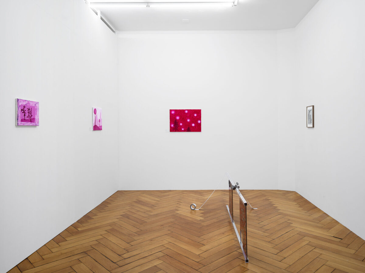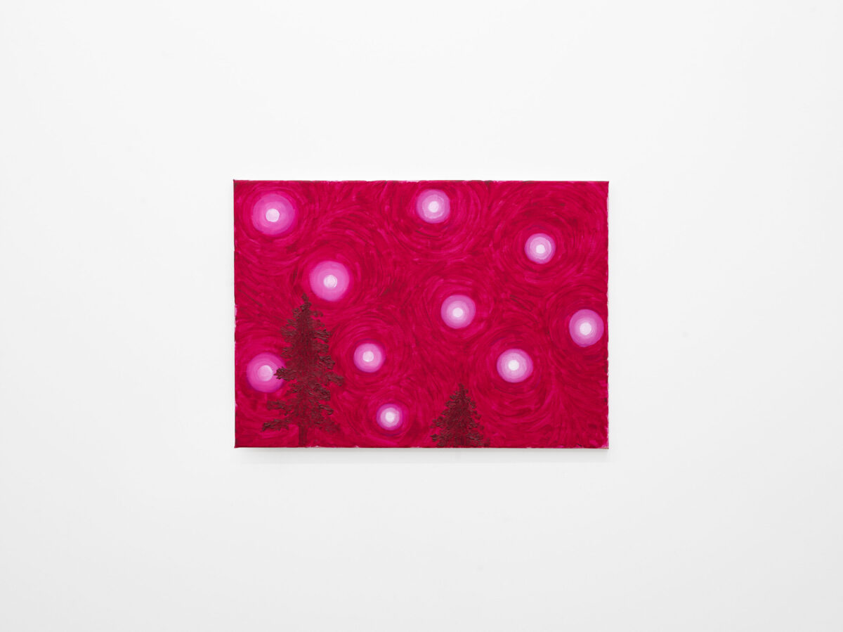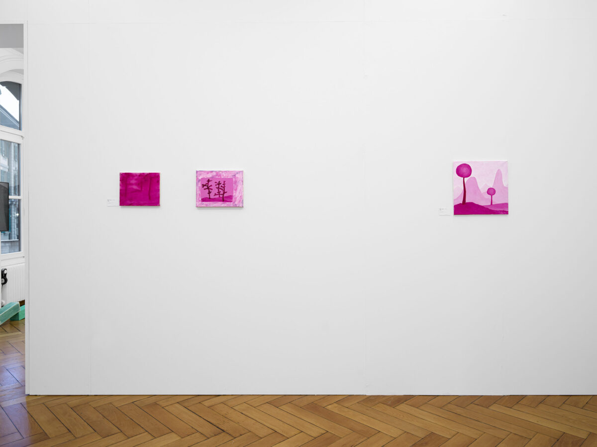 HANNES ZULAUFs Bilder Ohne Titel (Sugar Coating) (2022) entstammen einer Serie pinker Landschaftsmalereien. Man könnte sie als eine Art der subjektiven Bewältigung von Malereigeschichte Verstehen: Der Künstler arbeitet sich, reduziert auf drei Farben, an Topoi der Landschaftsmalerei ab. Wie in einer pinken Ausnüchterungszelle oder der die 1950er und seine Rollenbilder beschwörende Zuckerguss auf Cupcakes, kippt die liebliche Farbe in Hannes Zulaufs Bilder manchmal ins latent Bedrohliche. In Auseinandersetzung mit der Geschichte der Malerei ist diese Serie u.a. als eine Beschäftigung mit nationalistischer Vereinnahmung von Landschaftsmalerei zu verstehen.