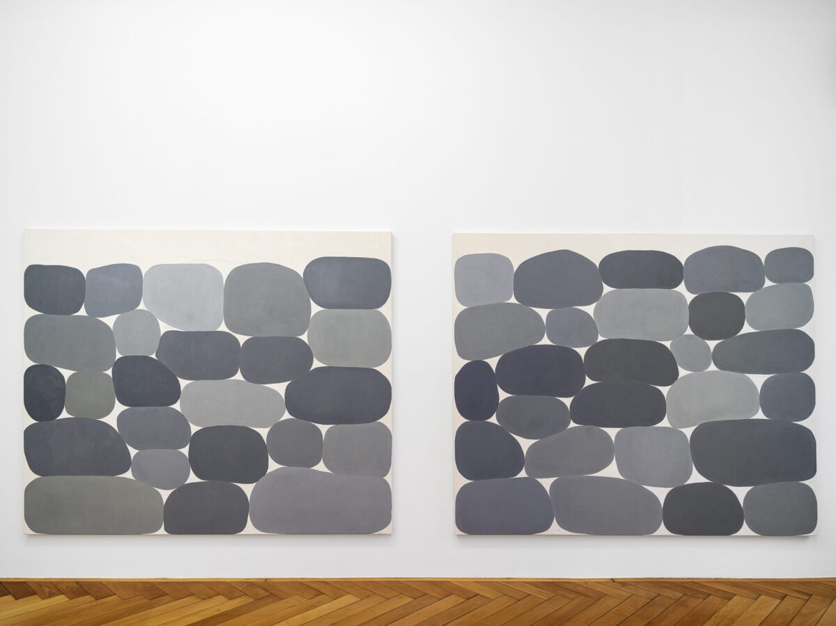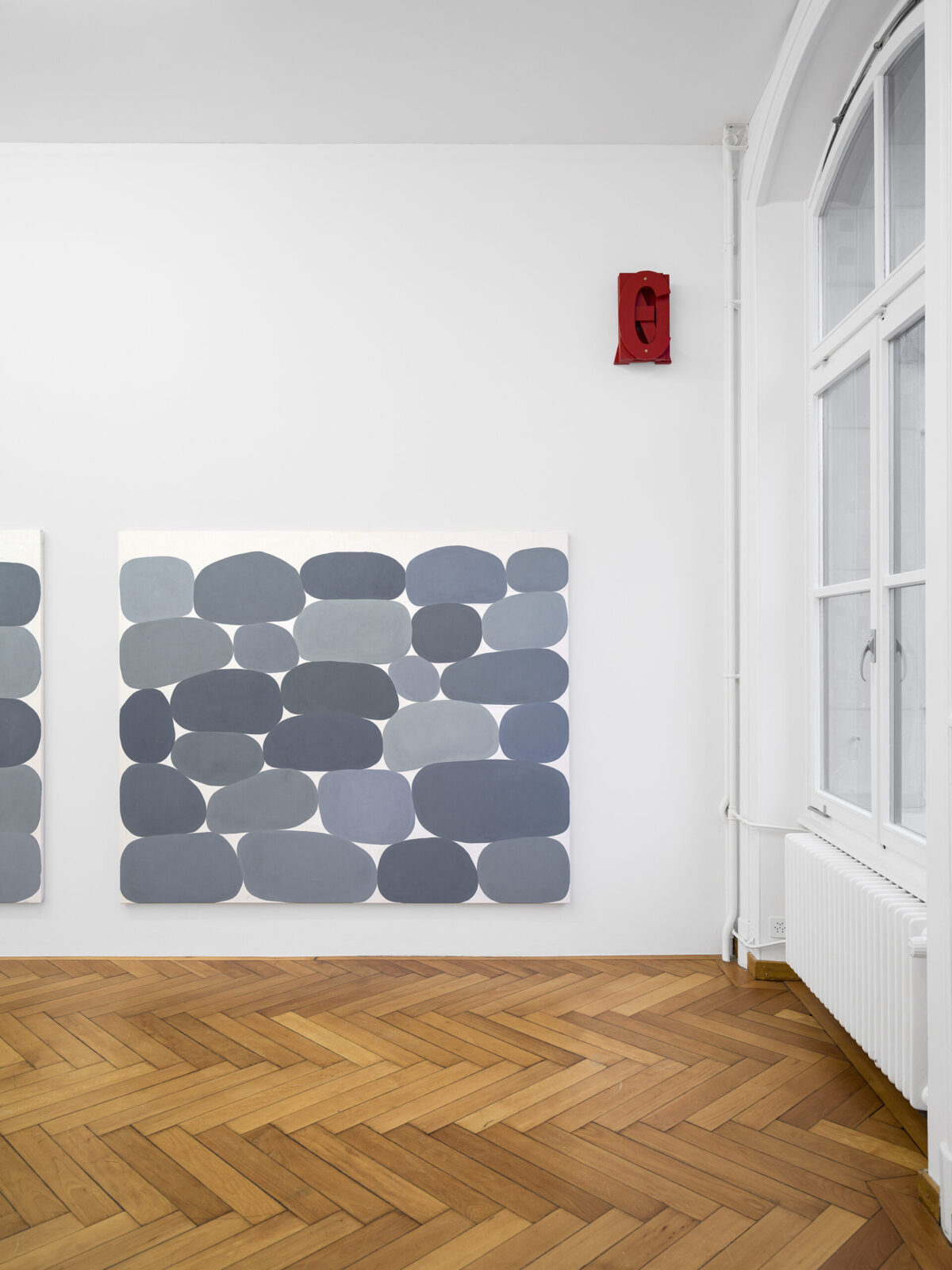 TOBIAS HAUSWIRTH (*1998, lebt und arbeitet in Biel) interessiert sich in seiner Malerei für zeichenhafte Flächen. In Mauer 1 & 2 (2022) schichtet er Stein für Stein in unterschiedlichem Grau zu einer Mauer, die sich exakt über das Format der Leinwand erstreckt und nur am oberen Bildrand einen Blick dahinter suggeriert. Die darstellende Malerei kann sich manchmal anfühlen wie eine Wand aus Farbe, indem sie durch das Abbilden die materielle Dimension eines Bildes negiert. So lautete zumindest eine gängige Kritik abstrakter Maler:innen. Vielleicht ist Mauer 1 & 2 ein humorvoller Kommentar einer Malerei, die Abstraktion und Figuration miteinander vereint.