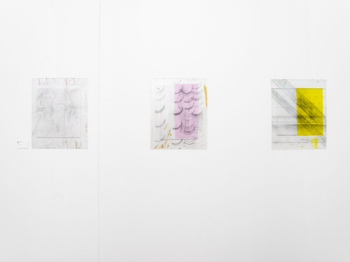 Der spanische Titel von NADINE K. CENOZ (*1989, lebt in Bern und Buenos Aires) Serie Rajadas (2022) kann mit «ritzen», «(auf)schneiden» oder «aufspalten» übersetzt werden. In argentinischem Spanisch bedeutet er umgangssprachlich so viel wie «sich aus dem Staub machen». In Anlehnung an Deleuze und Guattaris Konzept der Flucht, kann für Nadine K.Cenoz das Fliehen als ein revolutionärer Akt verstanden werden, in dem das markiert wird, vor dem man flieht. In dem Sinn ist Rajar für die Künstlerin «ein konzeptuelles Werkzeug um im Hegemonischen, im Gelernten, im Wiederholten, in binären Imperativen Spuren, respektive Fluchtlinien zu hinterlassen.» Die in Plexiglas gekratzten Körper ergründen das Verhältnis zwischen Körper und Umgebung, indem der Raum, den die Figuren umgibt, von Unbestimmtheit geprägt wird.